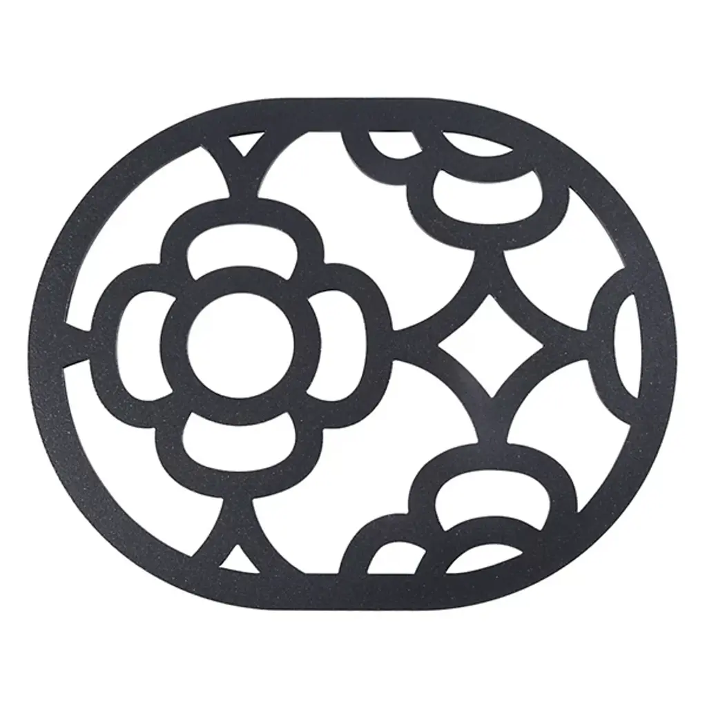 A lovely, lacy way to dress up a modern tabletop. The Lorette Trivet by Fermob shows off an enlarged detail of the perforated floral motif seen throughout the Lorette collection. For this trivet, the pattern is laser-cut out of solid steel and finished in an attractive and protective powder coat. Non-slip pads on the bottom keep this trivet stable on smooth surfaces to safeguard them against hot dishes and provide undeniable decorative appeal. Designed by Frederic Sofia.