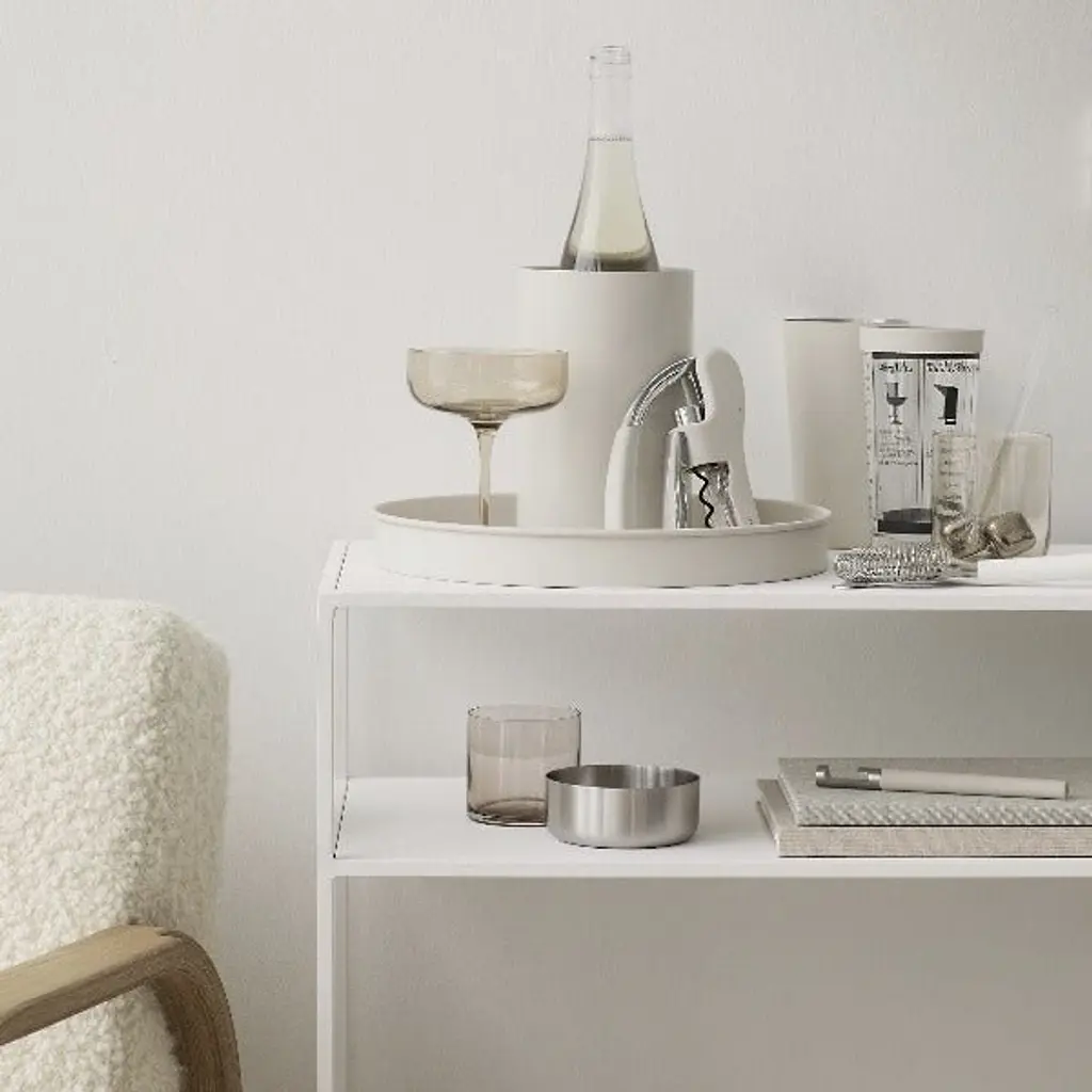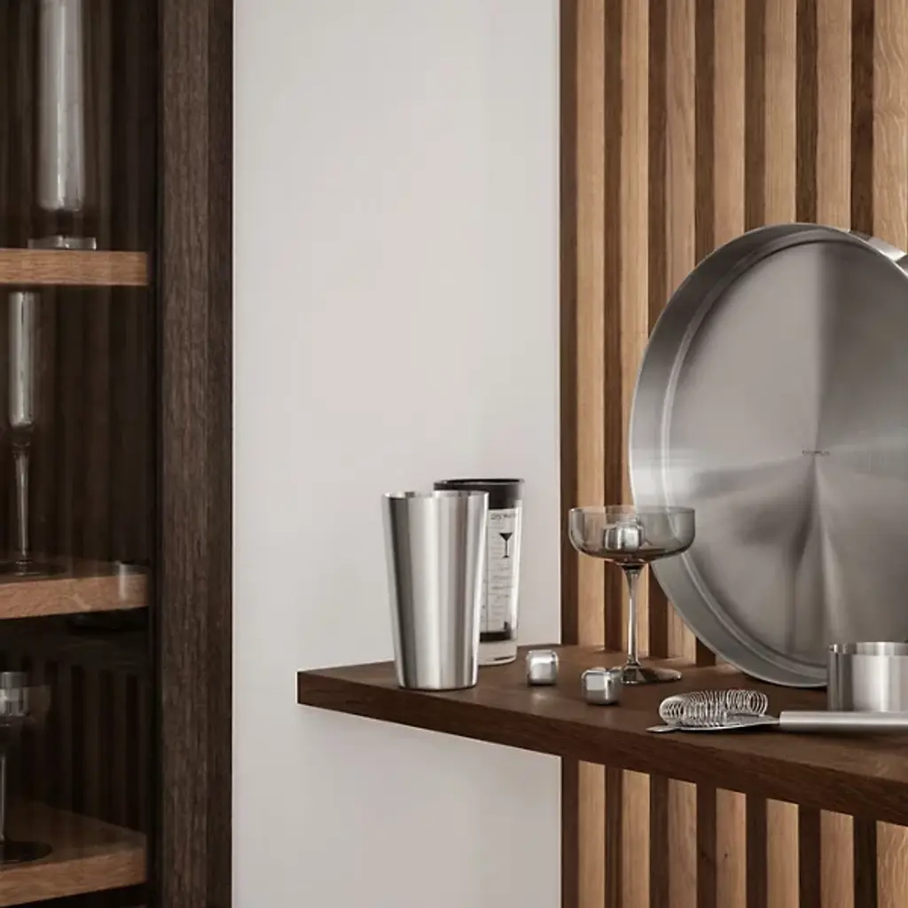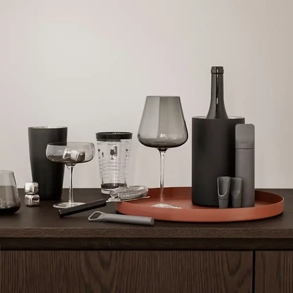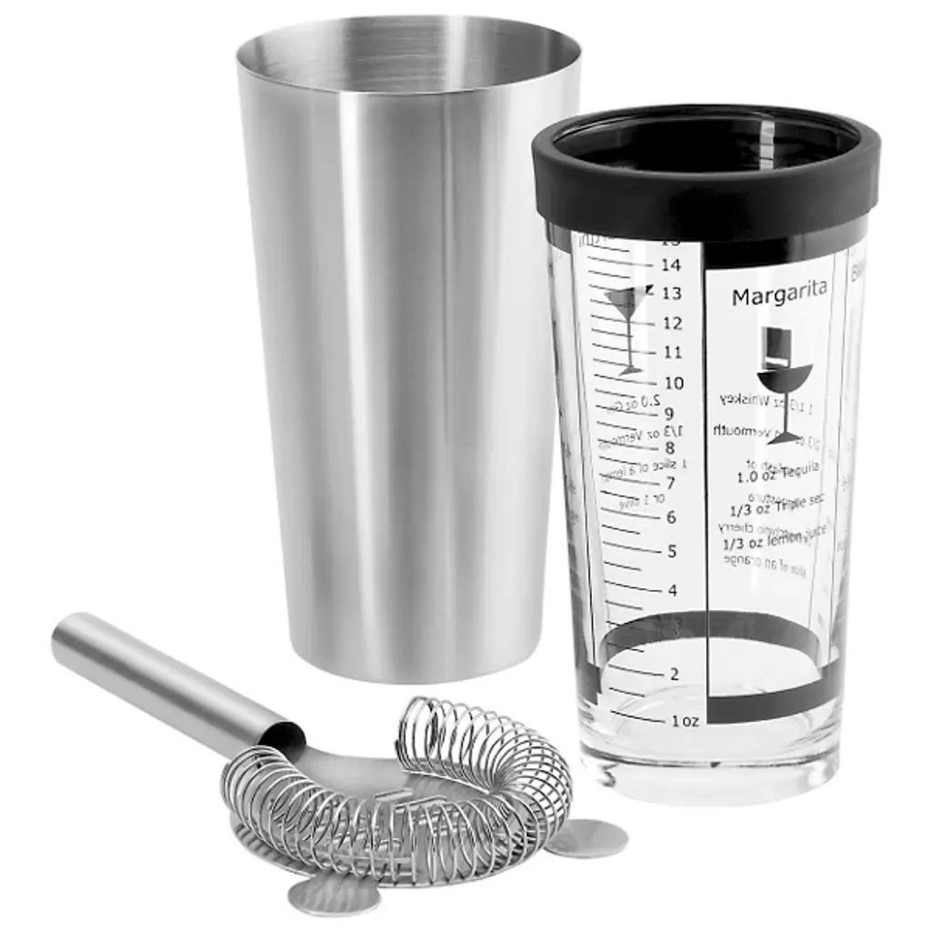 The Blomus LOUNGE Boston Shaker Set is a classic Boston set with the addition of a strainer. Common recipes (like how to mix a margarita), along with graduated measurements, can be found on the clear mixing glass, which is also rimmed with a protective rubber edge to avoid chipping.