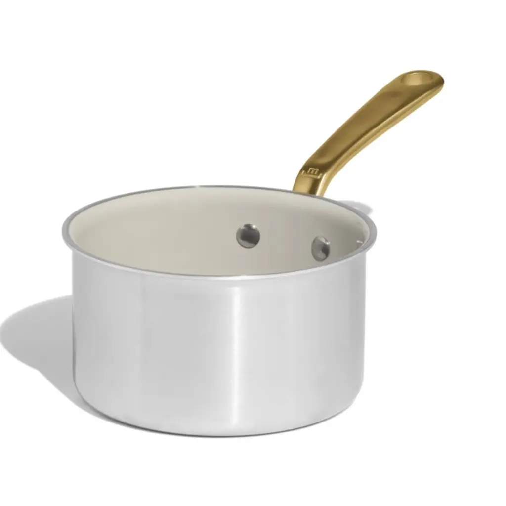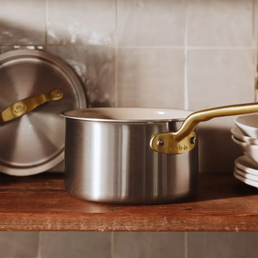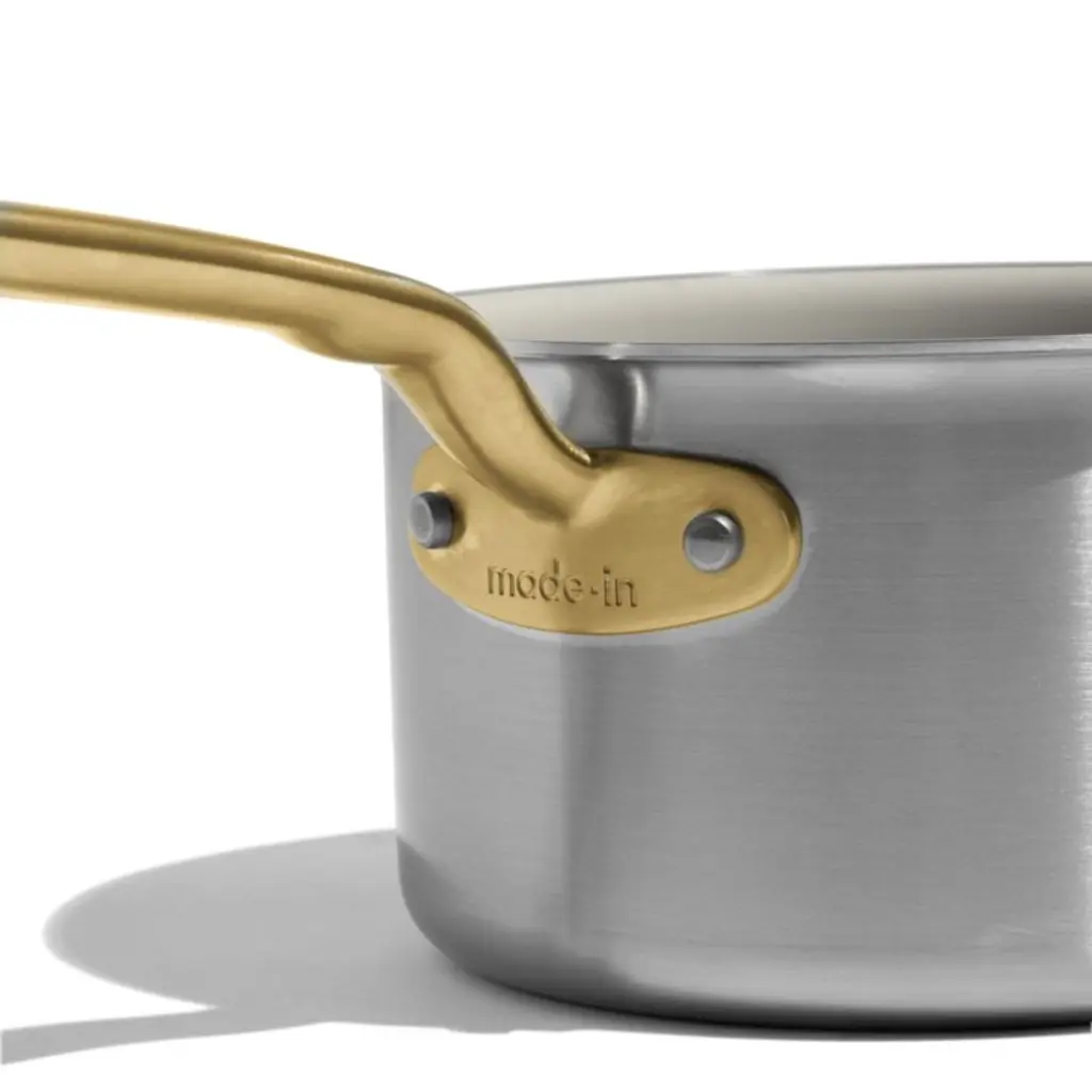 Italian-made CeramiClad cookware from Made In brings professional-level quality and durability home. Five-ply construction envelops a triple aluminum core for optimal heat conduction in stainless steel finished with a creamy ceramic non-stick cooking surface. The layered structure eliminates hot spotsmeaning less stuck-on food and less scrubbing. Perfectly sized for cooking jammy eggs, oatmeal and sauces, this two-quart saucepan offers precise temperature control so contents simmer without boiling over. Stay-cool handles with a gleaming antique brass finish that's exclusive to Crate & Barrel make the pan comfortable to carry, and a rolled rim ensures easy pouring. Timeless with traditional styling, this saucepan pairs with our other Made In cookware to outfit your kitchen beautifully.