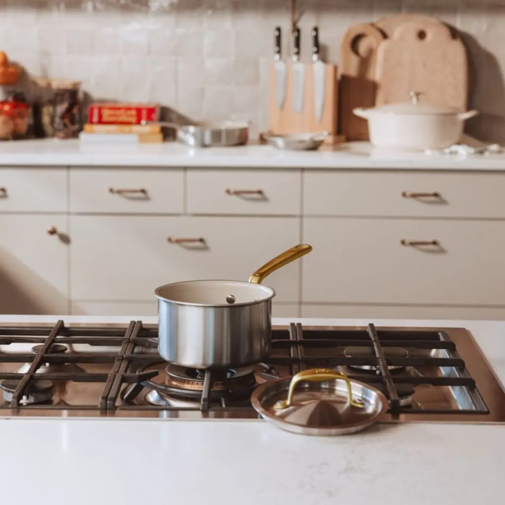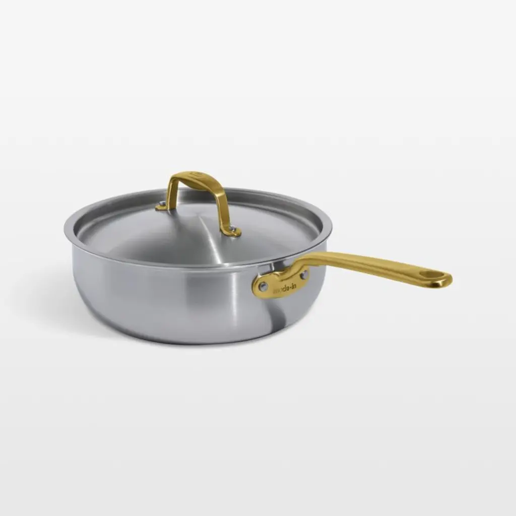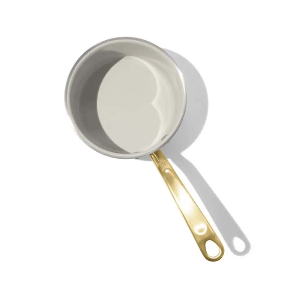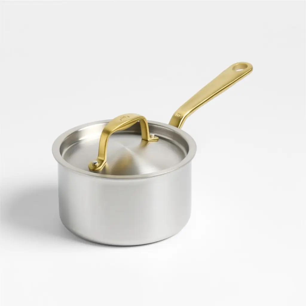 Italian-made CeramiClad cookware from Made In brings professional-level quality and durability home. Five-ply construction envelops a triple aluminum core for optimal heat conduction in stainless steel finished with a creamy ceramic non-stick cooking surface. The layered structure eliminates hot spotsmeaning less stuck-on food and less scrubbing. Perfectly sized for cooking jammy eggs, oatmeal and sauces, this two-quart saucepan offers precise temperature control so contents simmer without boiling over. Stay-cool handles with a gleaming antique brass finish that's exclusive to Crate & Barrel make the pan comfortable to carry, and a rolled rim ensures easy pouring. Timeless with traditional styling, this saucepan pairs with our other Made In cookware to outfit your kitchen beautifully.
