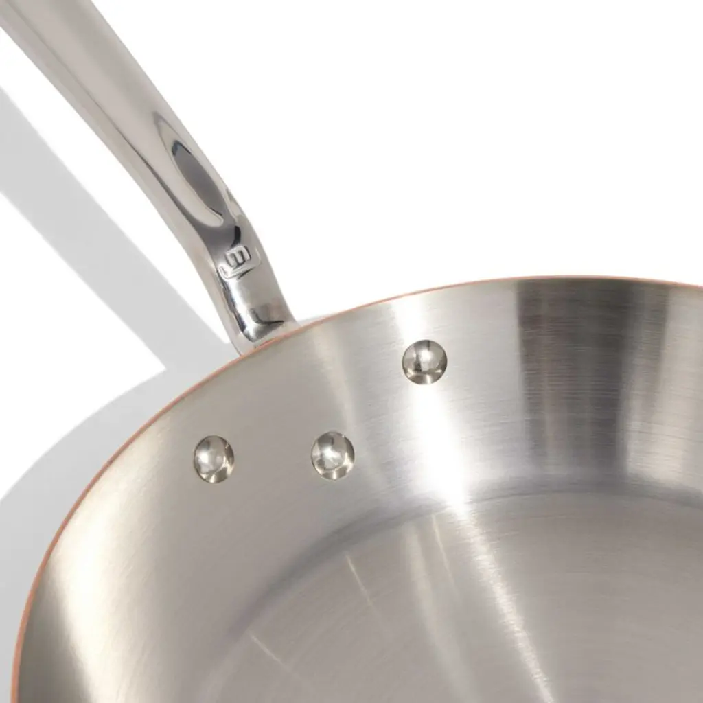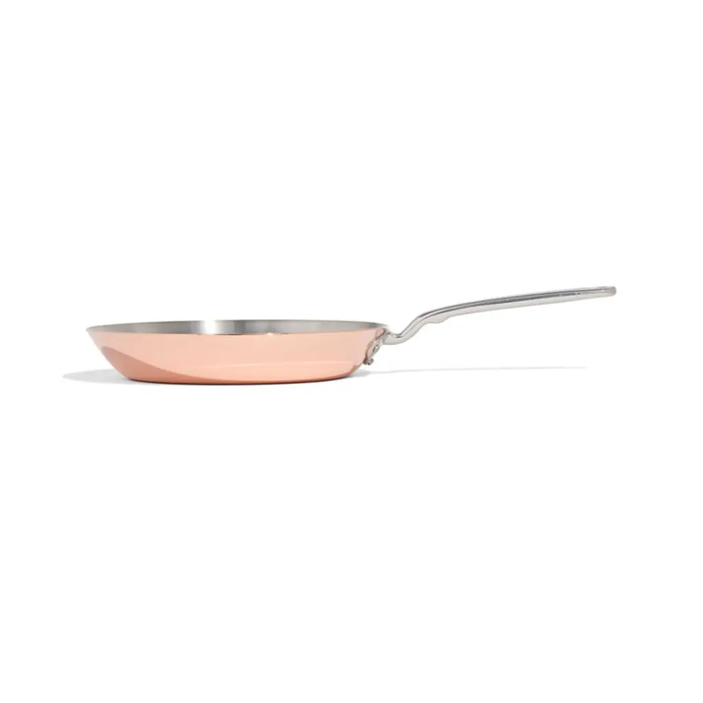 French-made copper cookware from Made In brings professional-level quality and durability home. The gorgeous copper exterior conducts heat incredibly quickly, while the durable stainless steel cooking surface stands up to high heat. Constructed with a flared rim that encourages evaporation, the frying pan sears, stir-fries, sautes and fries to crisp golden-brown perfection. A stay-cool handle makes the pan comfortable to carry. Timeless with traditional styling, the fry pan pairs with our other Made In cookware to outfit your kitchen beautifully.