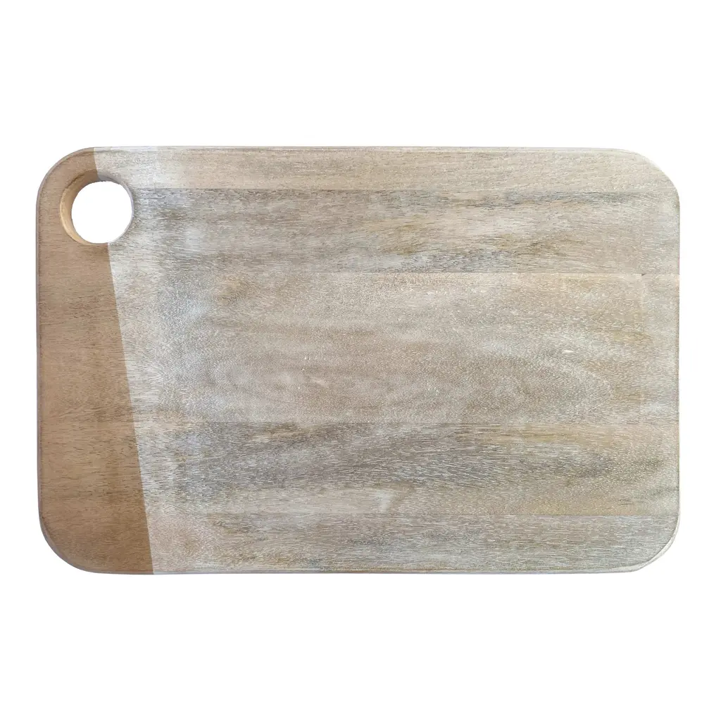 This whitewashed mango wood rectangle cheese/cutting board is a beautiful and practical piece that will enhance the home with its simple charm. The cheese/cutting board is made of whitewashed mango wood, a sustainable and durable material harvested from mango trees that no longer produce fruit. The whitewashed finish gives the wood a vintage look and feel, adding character and charm to the space. The cheese/cutting board is rectangular and complements any type of cheese or food. The cheese/cutting board also has a handle that makes it easy to carry and serve. The handle also has a hole that hangs the cheese/cutting board on a wall or hook for easy storage and display. Use it to slice, chop, or serve cheese, bread, fruits, vegetables, or other snacks. Whether used for everyday use or special occasions, this whitewashed mango wood rectangle cheese/cutting board will add a touch of vintage charm and functionality to the kitchen or dining room. It measures 14.75 inches in length and 9.75 inches in width. From everyday use to special occasions, this cheese and cutting board is perfect for any kitchen or dining room.Features: