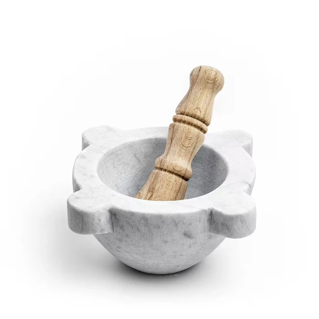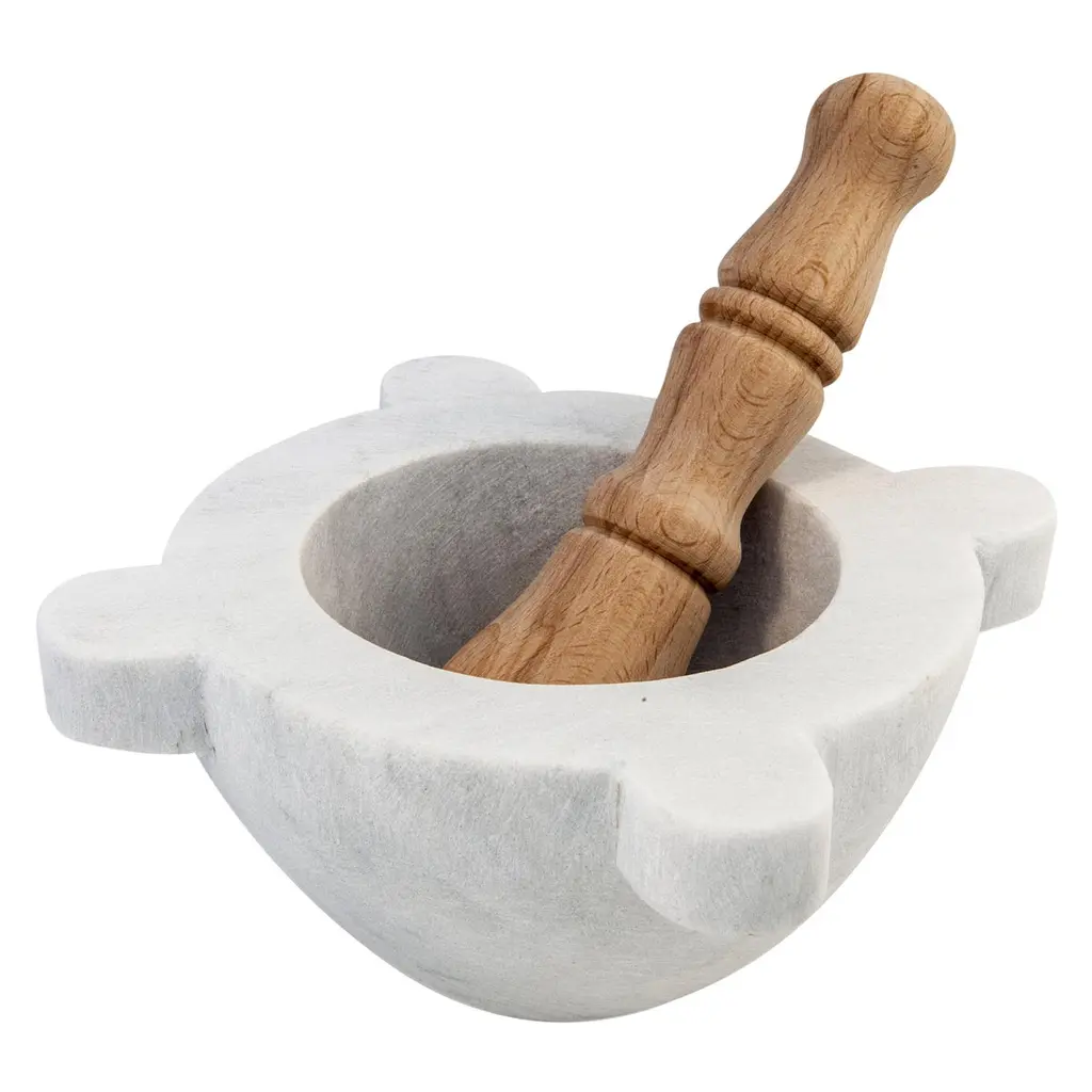 This elegant set including a mortar (Ø 22.5 cm x H 10cm ) and a wooden pestle (Ø 5 cm x H 21 cm ) is crafted with utmost care. The sturdy mortar is fashioned of prized white marble and its edge is embellished with four carved, rounded elements that are at once useful and decorative. Circular carvings adorn the wooden pestle's surface as a sober accent of refinement.