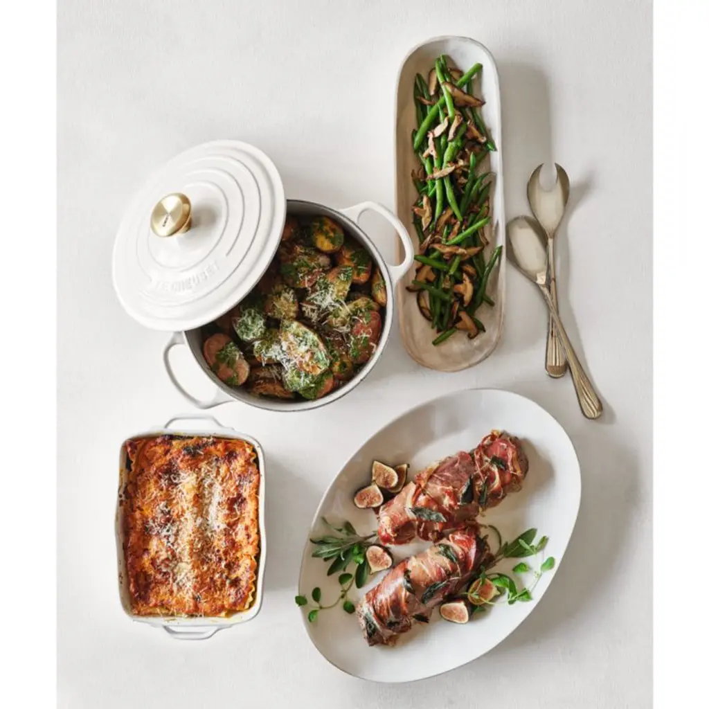 Subtle hand-antiquing on the freeform rim finishes our artisanal ceramic baker glazed in soft white. The unique form suits organic modern tables and is plenty chic for elegant occasions. Made of durable stoneware, the baker is sturdy enough for use every day. Rustic handles carry the small baking dish easily from the oven to the table, where it beautifully presents baked side dishes and smaller desserts. Our dishwasher-safe rectangular baker cleans up easily after dinner parties and family meals. For a coordinated dining aesthetic, set a table with our Marin dinnerware and other serving pieces, all Crate and Barrel exclusives. Due to its handcrafted nature, each small baker will be unique.