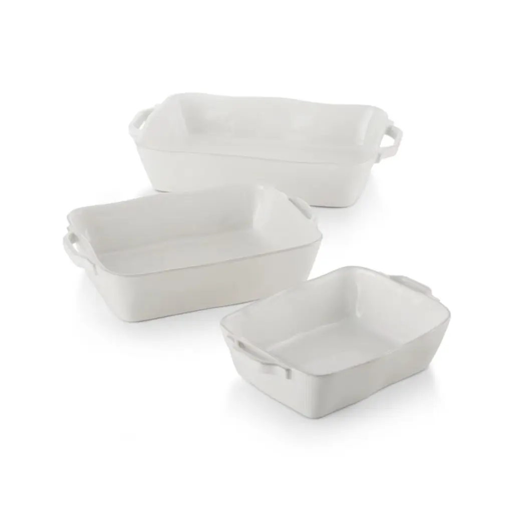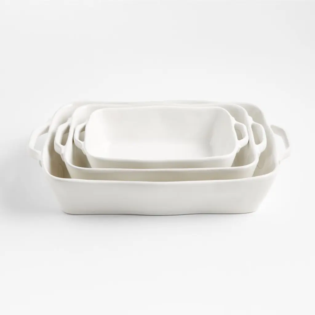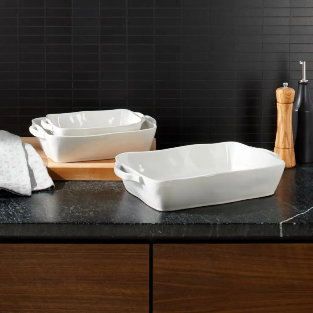 Subtle hand-antiquing on the freeform rim finishes our three artisanal ceramic bakers glazed in soft white. The unique form suits organic modern tables and is plenty chic for elegant occasions. Made of durable stoneware, the baker is sturdy enough for use every day. Rustic handles carry the small, medium and large baking dishes easily from the oven to the table, where they beautifully present side dishes, entrees and desserts. Microwave- and oven-safe, our three rectangular bakers are also dishwasher-safe for easy cleanup after dinner parties and family meals. For a cohesive dining aesthetic, set a table with our Marin dinnerware and other serving pieces, all Crate and Barrel exclusives. Due to its handcrafted nature, each baking dish will unique.