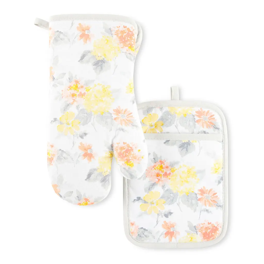 Martha Stewart Amber Floral Oven Mitt & Pot Holder Set 2-Pack - Om: 7"x13" & Ph: 7"x10" - Pink/yellow