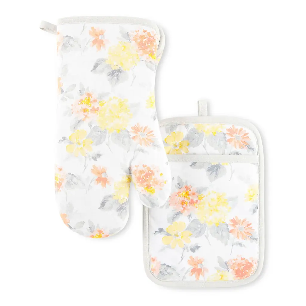 Martha Stewart Amber Floral Oven Mitt & Pot Holder Set 2-Pack - Om: 7"x13" & Ph: 7"x10" - Yellow/coral