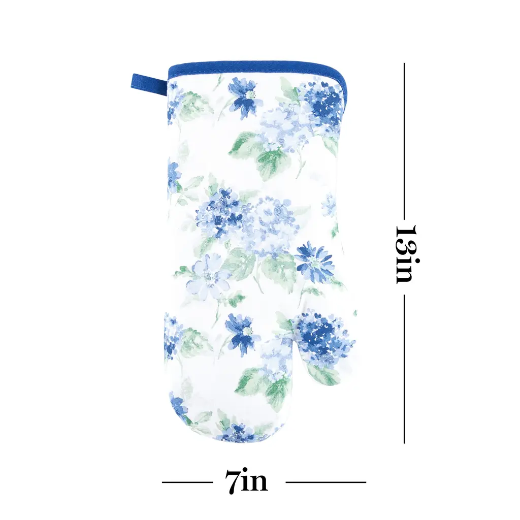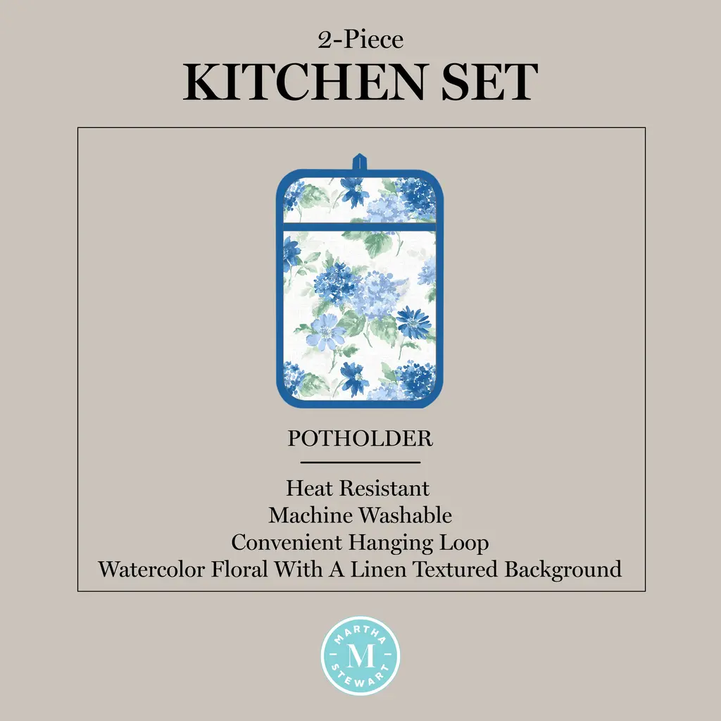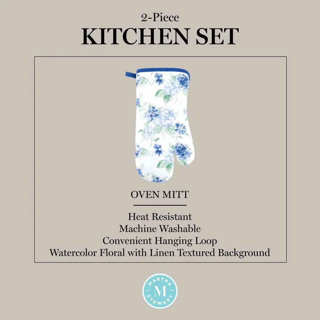Add style and function to your kitchen décor with the Martha Stewart Amber Floral Oven Mitt and Pot Holder 2-Pack Set. Made of 100% Cotton, this set offers a beautiful combination of comfort and insulation. This watercolor floral set includes one oven mitt measuring 7 inches wide by 13 inches long and one pot holder that measures 7 inches wide by 10 inches long for easy use. They are heat resistant and will shield your hands from the heat while cooking and baking. The pot holder includes sturdy silicone grips and both pieces have a convenient hanging loop for display or easy storage. Machine washable for easy cleaning.