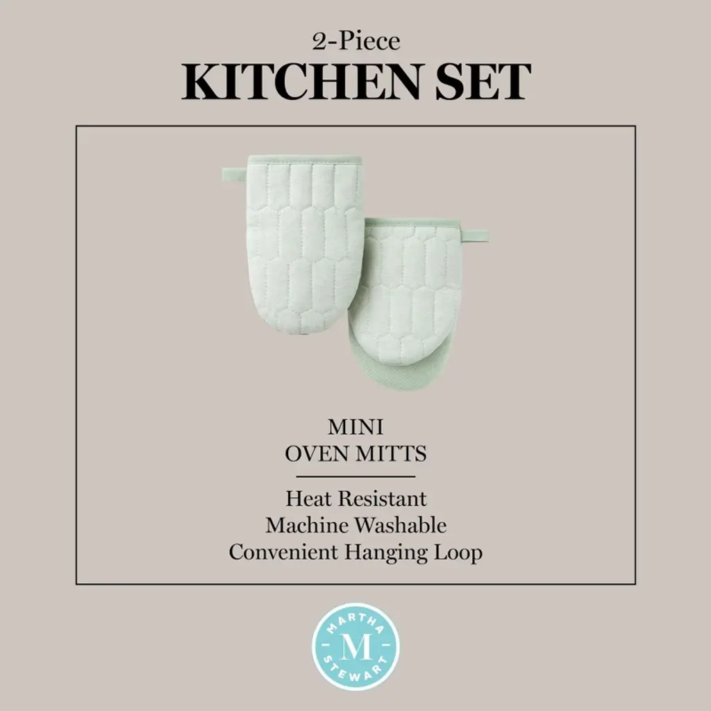 Refresh your kitchen essentials and decor with the Martha Stewart Honeycomb Chambray Textured Kitchen Collection. Whether you�re looking for kitchen towels, oven mitts, pot holders or table linens, this stylish collection will bring style and texture to your home. The Martha Stewart Honeycomb Quilted Chambray Mini Oven Mitt Set includes two decorative mini oven mitts. These heat resistant oven mitts are durable, provide a flexible non-slip silicone grip, and protect your hands while cooking or baking your favorite Martha Stewart recipes. Use while hosting and serving guests or as an everyday kitchen essential while cooking. Made of machine washable Cotton, these oven mitts are easy to clean, dry and store with decorative hang loop.