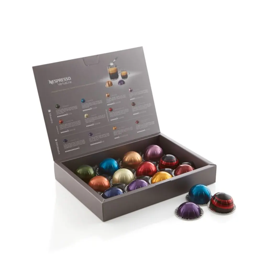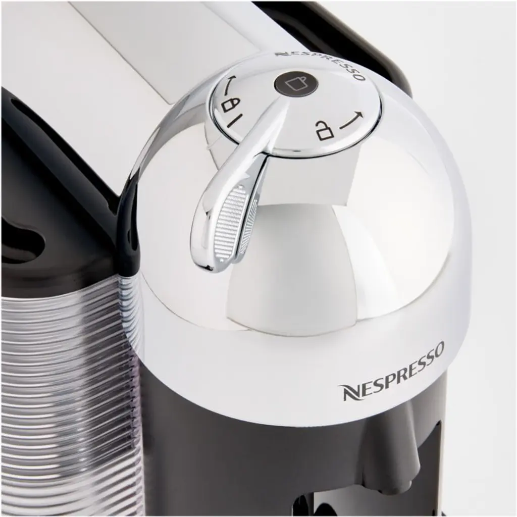 The first Nespresso machine that brews both coffee and espresso. Using new centrifusion centrifugal heating element technology, brewing your cup is as simple as ever with the signature capsule system, quick push-button delivery and adjustable cup holder. Exclusive VertuoLine coded capsules in four sizes are automatically recognized, telling the system exactly how much water to heatin a mere 15 or 20 secondsfor a variety of drinks. This system creates rich naturally forced crema during espresso brewing. Capsules eject automatically without leakage. Accompanying starter pack includes 12 capsules designed exclusively for this line, including eight coffee options and four espresso options.Nespresso of Switzerland created the first coffee pod system over 40 years ago. Founded in Treviso, Italy, De'Longhi has been manufacturing appliances and parts since 1902.We now offer an in-store coffee capsule recycling program. Bring your empty aluminum Nespresso pods to Crate & Barrel and they will be recycled.Need help choosing? View our Nespresso comparison chart.