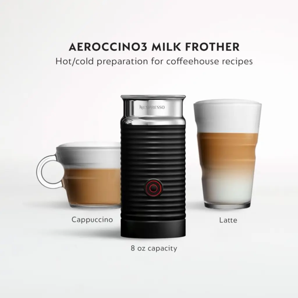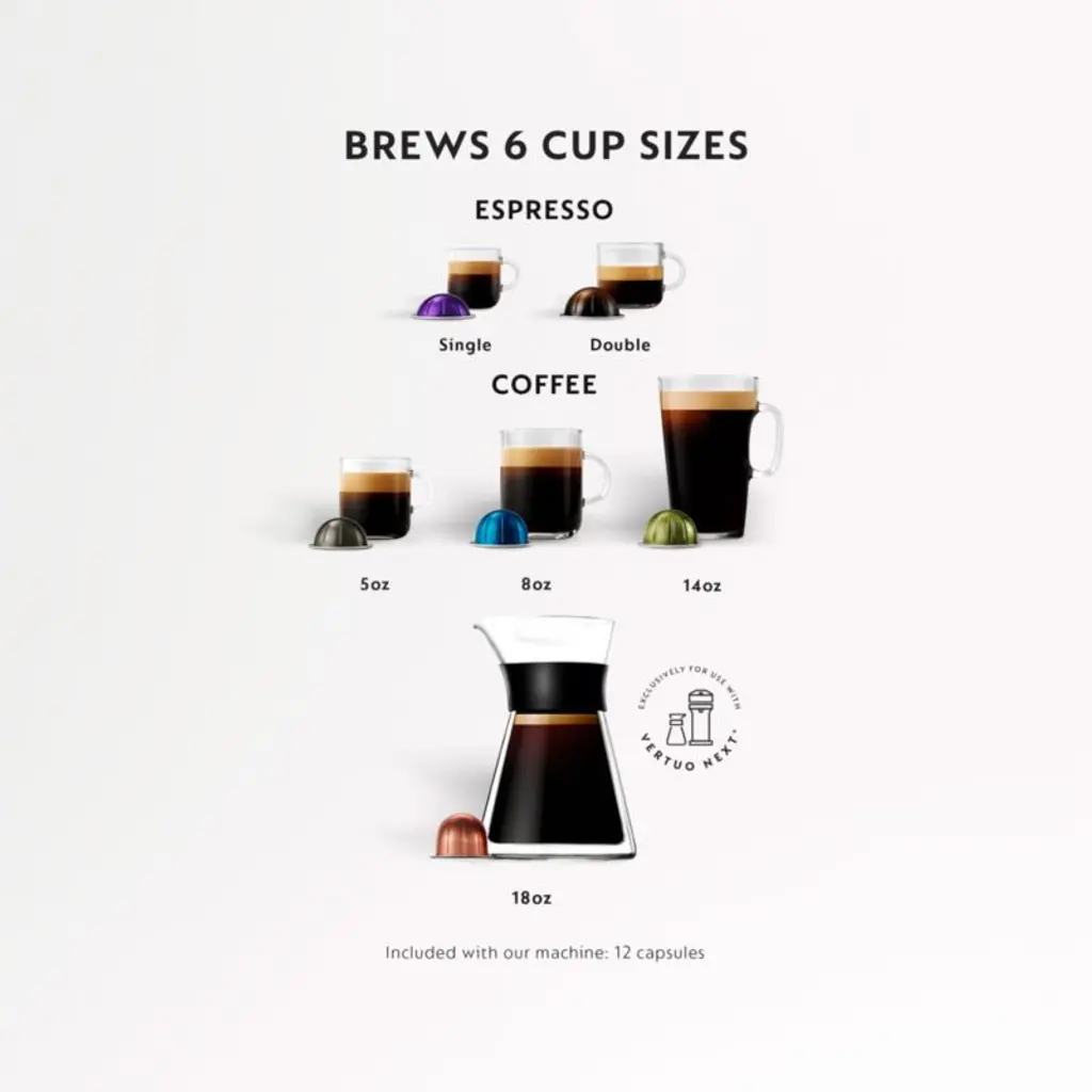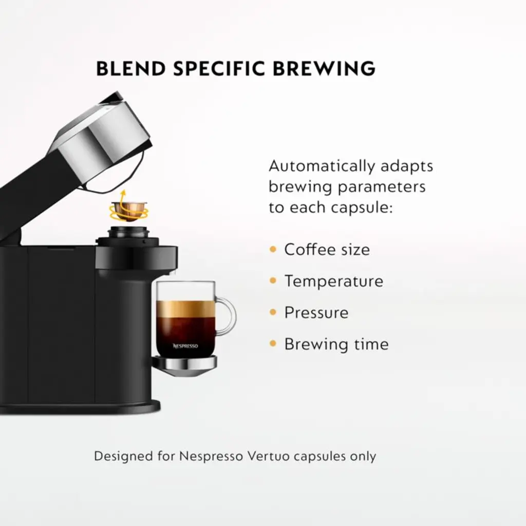Crema, the frothy finishing touch on a perfectly pulled espresso, is now available for your morning cup of coffee. Using Nespresso's innovative Centrifusion extraction technology, the Vertuo Next tops each coffee and espresso with a generous layer of the prized creaminess. This advanced machine brews drinks using coffee capsules, each of which includes a barcode that automatically adjusts the brewing parameters for ideal extraction. Easy-to-use, the Aeroccino quickly creates cold foam, hot foam or hot milk with the press of a button. The compact chrome Vertuo Next looks modern on coffee stations and countertops.Nespresso of Switzerland created the first coffee pod system over 40 years ago. Founded in Treviso, Italy, De'Longhi has been manufacturing appliances and parts since 1902.We now offer an in-store coffee capsule recycling program. Bring your empty aluminum Nespresso pods to Crate & Barrel and they will be recycled.Need help choosing? View our Nespresso comparison chart.