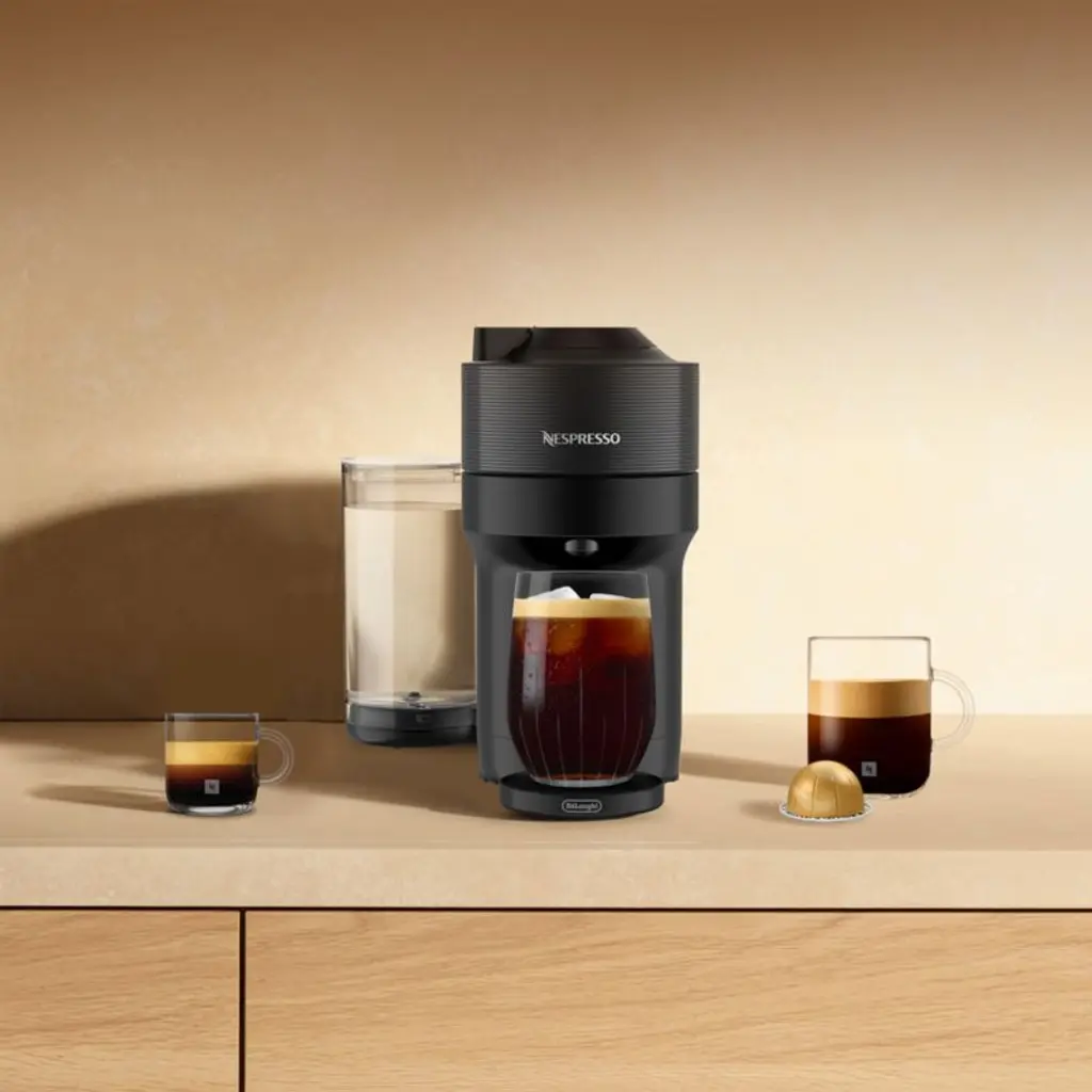 If you like iced coffee, you'll love this coffee maker and frother bundle from Nespresso. A double-click of the brew button creates a concentrated version of your coffee choice so you can enjoy the drink over ice. Using Nespresso's innovative Centrifusion extraction technology, the Vertuo Pop+ Deluxe produces a generous layer of frothy crema to top your espresso or coffee drink. This advanced machine brews using coffee capsules, each of which includes a barcode that automatically adjusts the brewing parameters for ideal extraction. To enhance your iced coffee experience, the set includes a travel mug and a sampling of coffee pods.Nespresso of Switzerland created the first coffee pod system over 40 years ago. Founded in Treviso, Italy, De'Longhi has been manufacturing appliances and parts since 1902.We now offer an in-store coffee capsule recycling program. Bring your empty aluminum Nespresso pods to Crate & Barrel and they will be recycled.