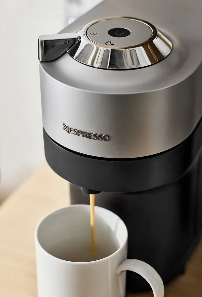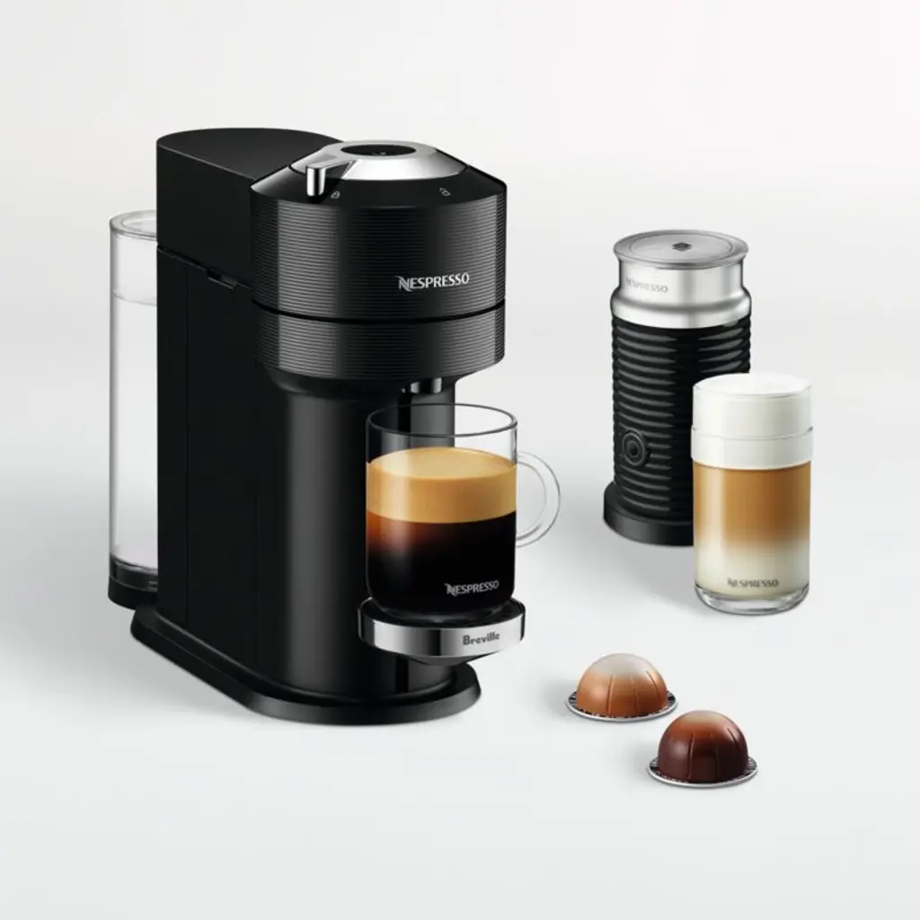Using Nespresso's innovative Centrifusion extraction technology, the Vertuo Pop+ Deluxe produces a generous layer of frothy crema to top your espresso or coffee drink. This advanced machine brews using coffee capsules, each of which includes a barcode that automatically adjusts the brewing parameters for ideal extraction. The easy-to-use Aeroccino quickly creates perfectly textured hot or cold milk foam. Connectivity features keep the machine updated and allow for maintenance via smartphone. Sleek and slim, the silver and black Vertuo looks modern on countertops and coffee stations.Nespresso of Switzerland created the first coffee pod system over 40 years ago. Founded in Treviso, Italy, De'Longhi has been manufacturing appliances and parts since 1902.We now offer an in-store coffee capsule recycling program. Bring your empty aluminum Nespresso pods to Crate & Barrel and they will be recycled.