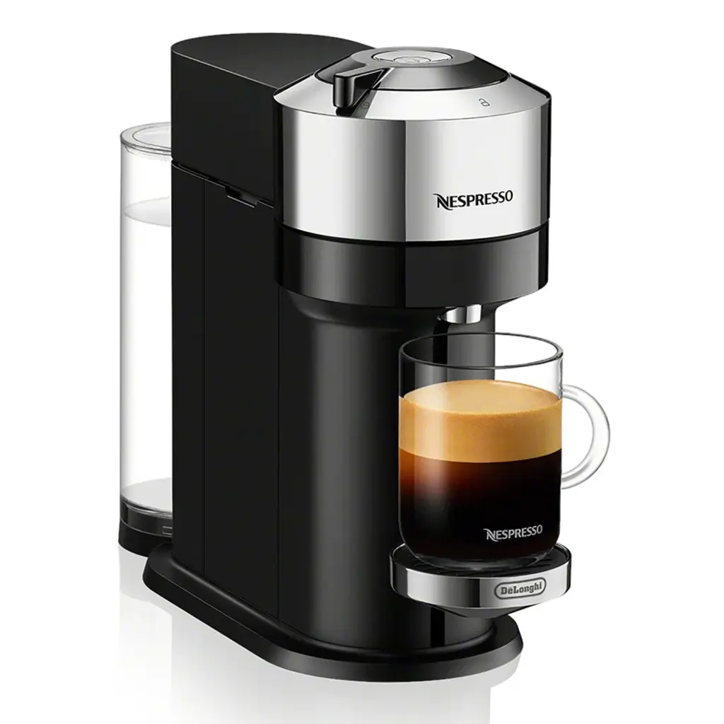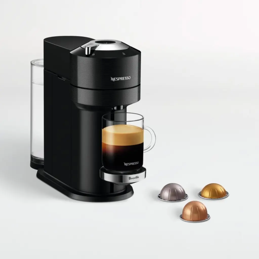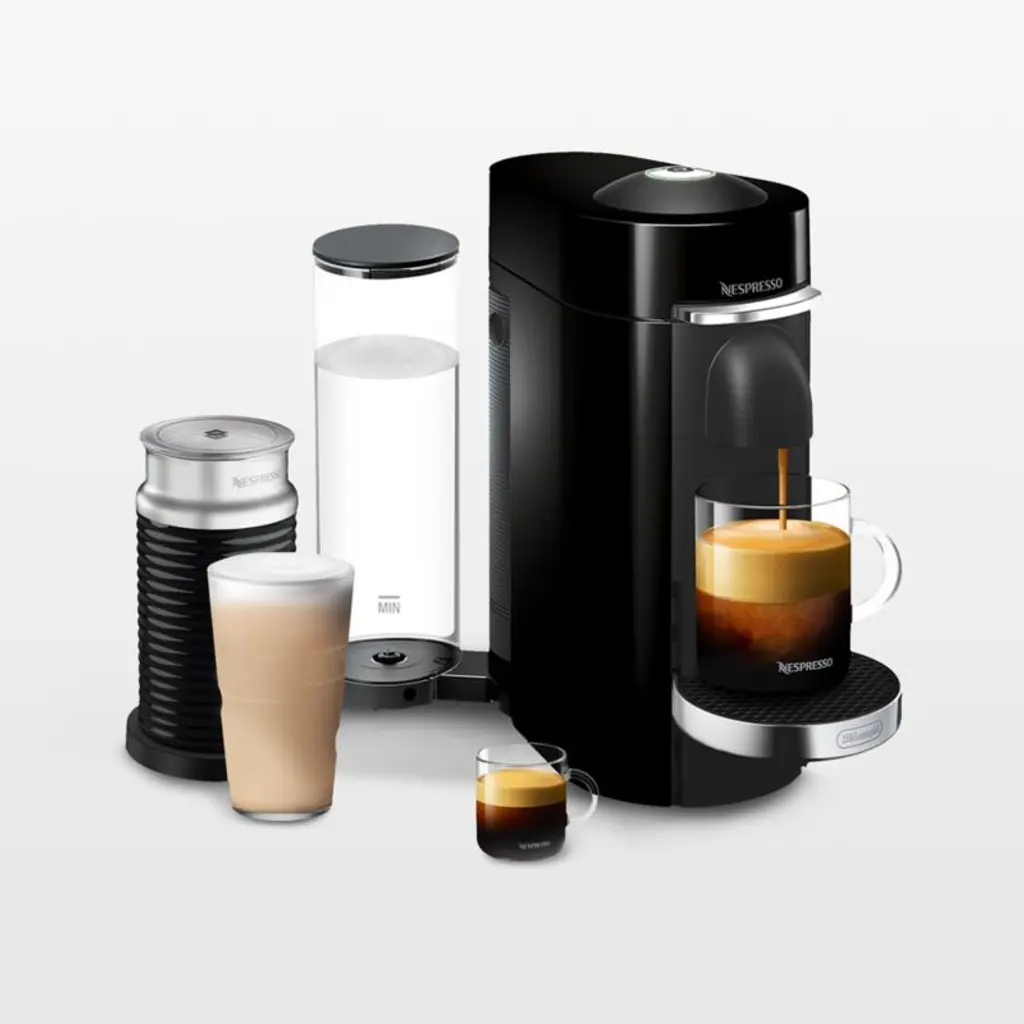 Using Nespresso's innovative Centrifusion extraction technology, the Vertuo Pop+ Deluxe produces a generous layer of frothy crema to top your espresso or coffee drink. This advanced machine brews using coffee capsules, each of which includes a barcode that automatically adjusts the brewing parameters for ideal extraction. Connectivity features keep the machine updated and allow for maintenance via smartphone. Sleek and slim, the matte black Vertuo looks modern on countertops and coffee stations.Nespresso of Switzerland created the first coffee pod system over 40 years ago. Founded in Treviso, Italy, De'Longhi has been manufacturing appliances and parts since 1902.We now offer an in-store coffee capsule recycling program. Bring your empty aluminum Nespresso pods to Crate & Barrel and they will be recycled.