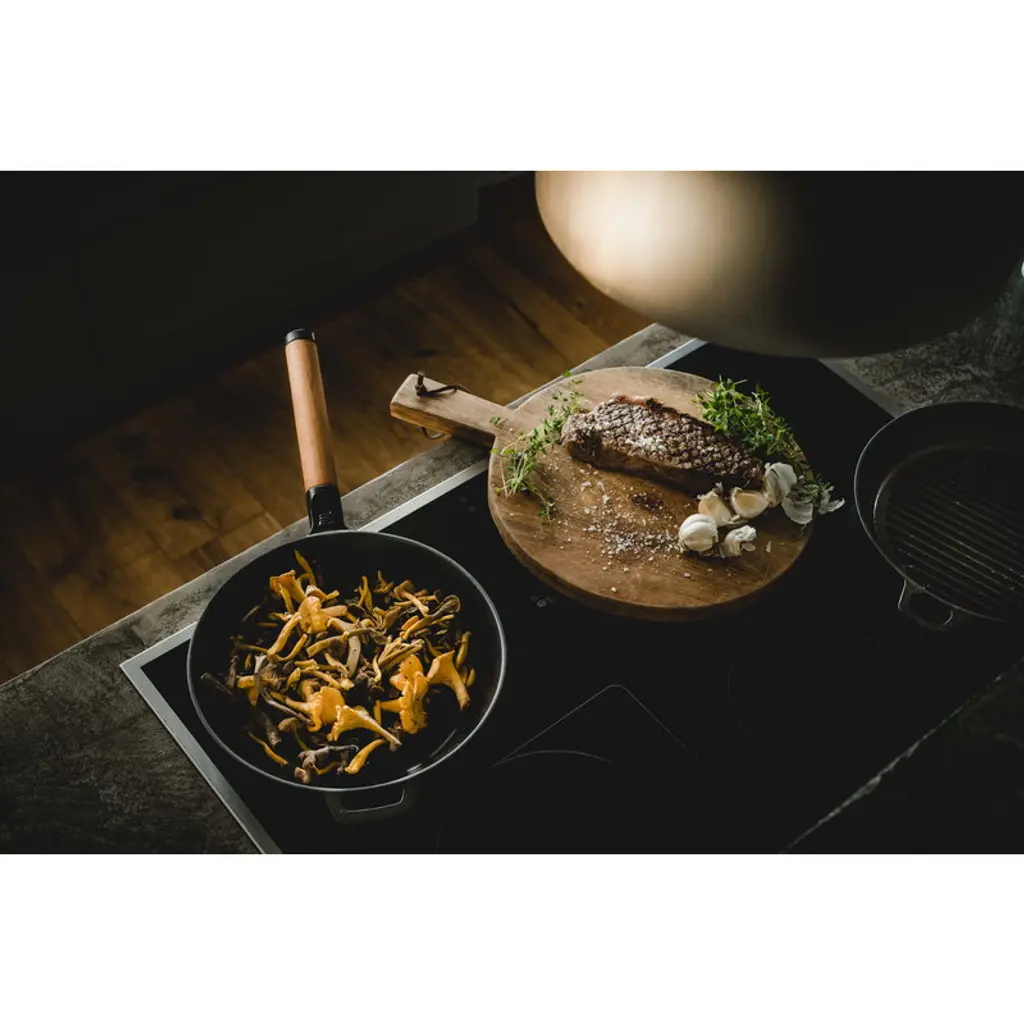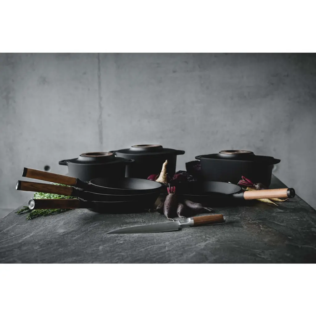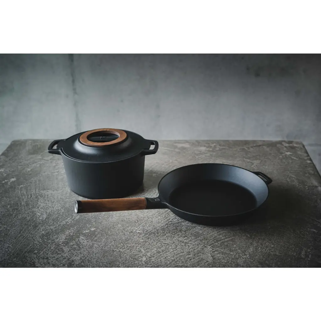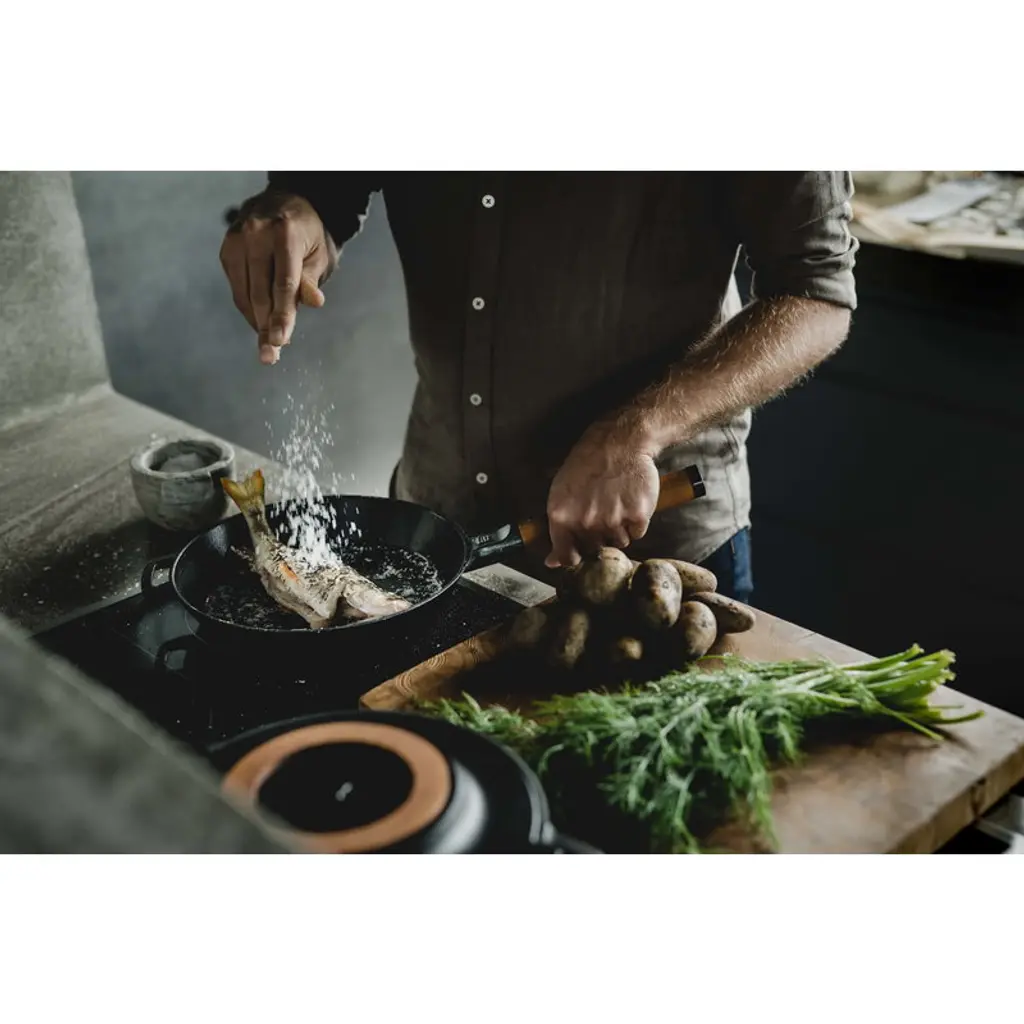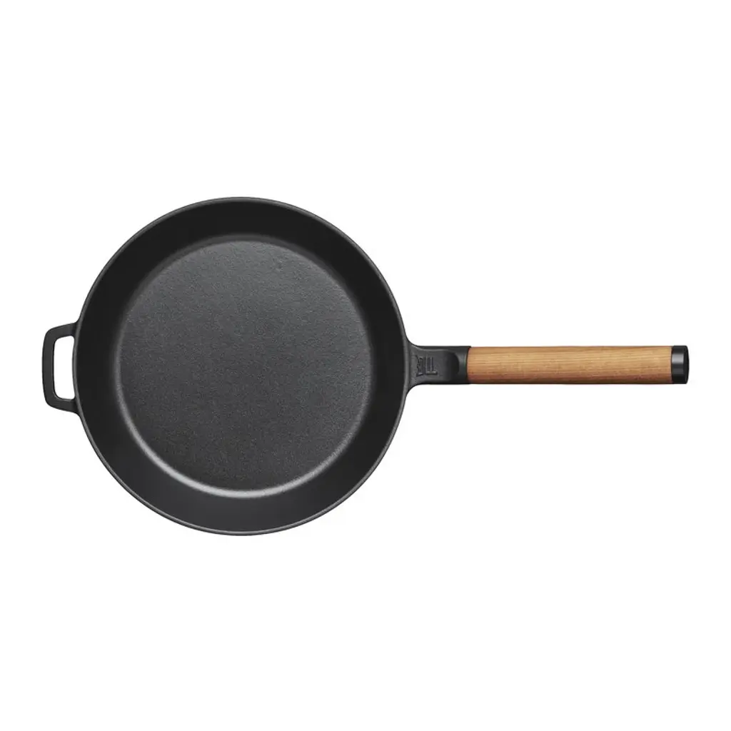 Fiskars Norden cast iron frying pan with removable wooden handle is a member of Fiskars' top-quality cookware range inspired by Nordic cooking traditions and Finnish knife-making heritage. Due to the unique Thermium mineral treatment, the pots and pans of the collection have a non-stick surface that is suitable for high temperatures. Thermium treatment also allows you to pre-fry the ingredients before further oven cooking. The pan is suitable for all hobs, even induction. The pots and knives of the collection are made in Finland using strong, durable and easy-to-maintenance materials such as steel, cast iron and wood. Fiskars Norden is a winner of Australia's Good Design Award 2018 and the Red Dot Design Award 2018.