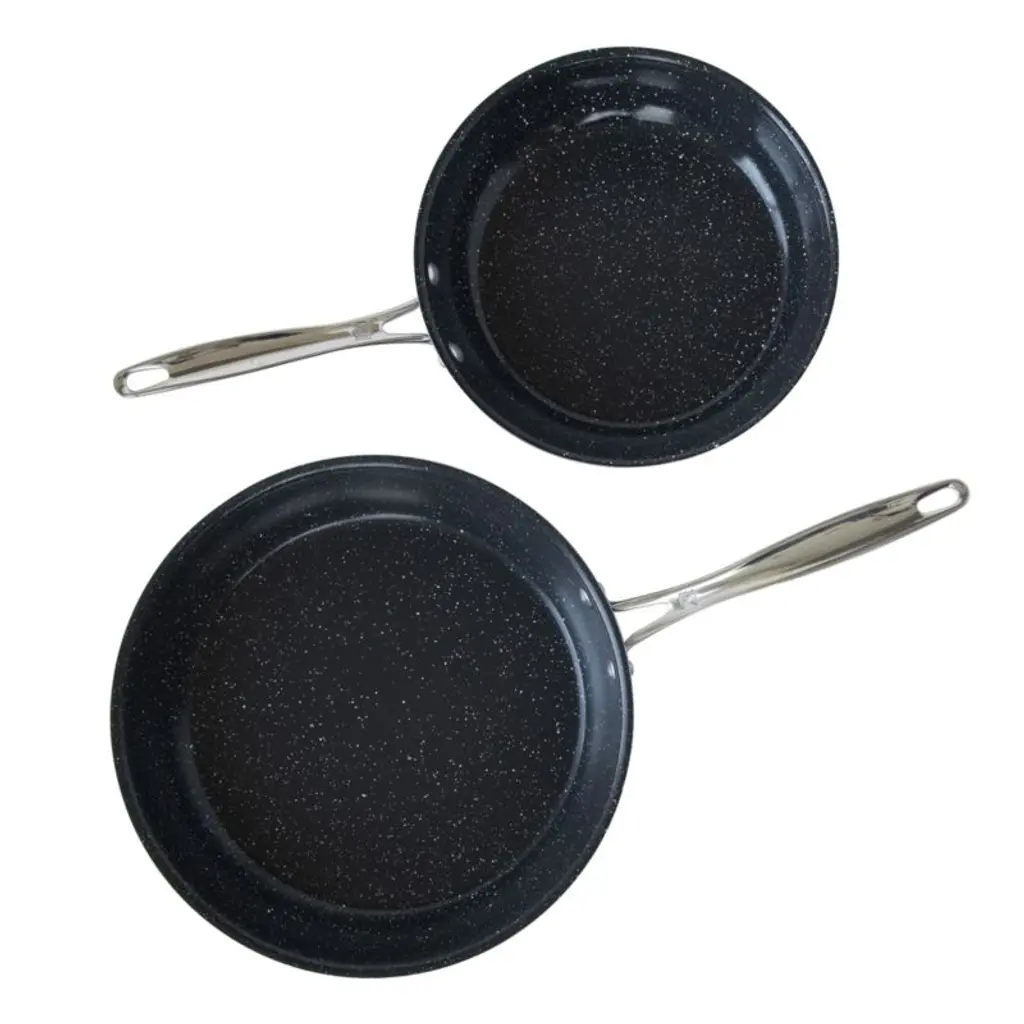 Legendary for bakeware, Nordic Ware brings the same excellence to cookware with this set of restaurant-quality saute skillets. Three ceramic layers give the restaurant-grade aluminized steel pans a non-stick finish that lasts. The black coating is showered with white speckles for a charming look reminiscent of classic campfire cookware. Fitted with stainless steel handles, the skillets go from stove to oven to table to serve eggs, sauteed mushrooms and more.Nordic Ware, a family-owned and -operated company, has been making high-quality bakeware for over 75 years.