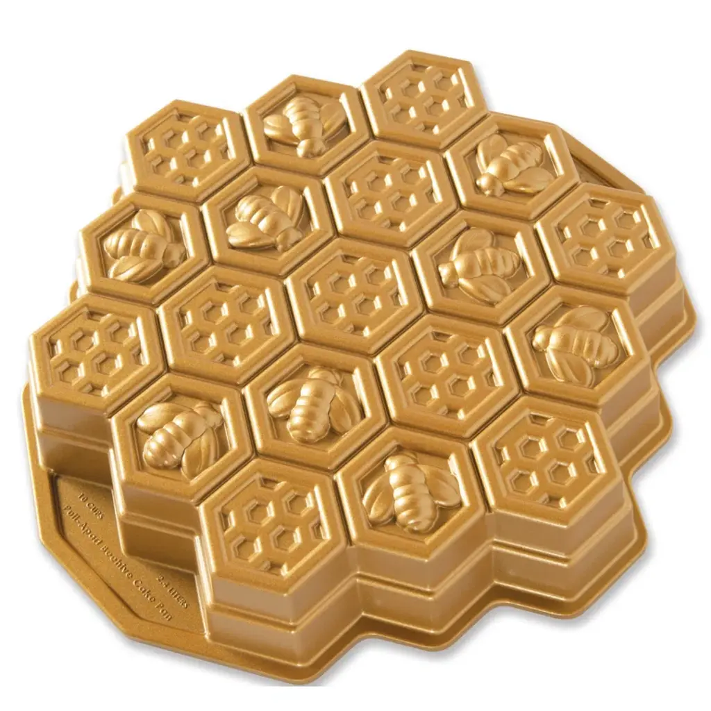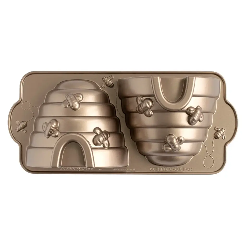 Bake petite bee-inspired treats for spring brunches, garden parties and baby showers in this golden pan. Particularly perfect for honey-infused recipes, the pan creates six mini cakes that make a delightful addition to spring and summer tables. Cast aluminum keeps the details of the charming skep beehives crisp, while the double layer of non-stick coating ensures a clean, easy release. The cakelet pan makes a sweet seasonal gift for your favorite baker.Nordic Ware, a family-owned and -operated company, has been making high-quality bakeware for over 70 years.