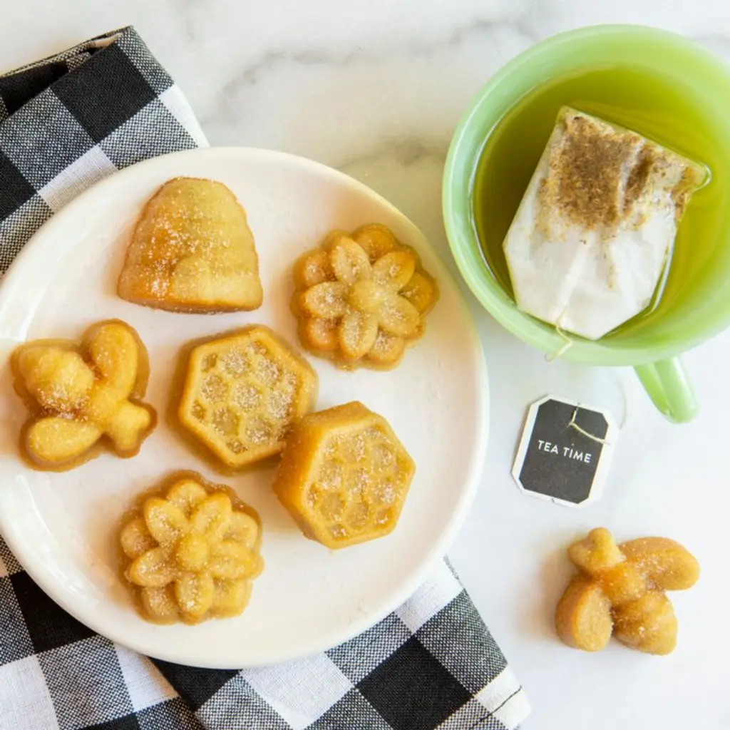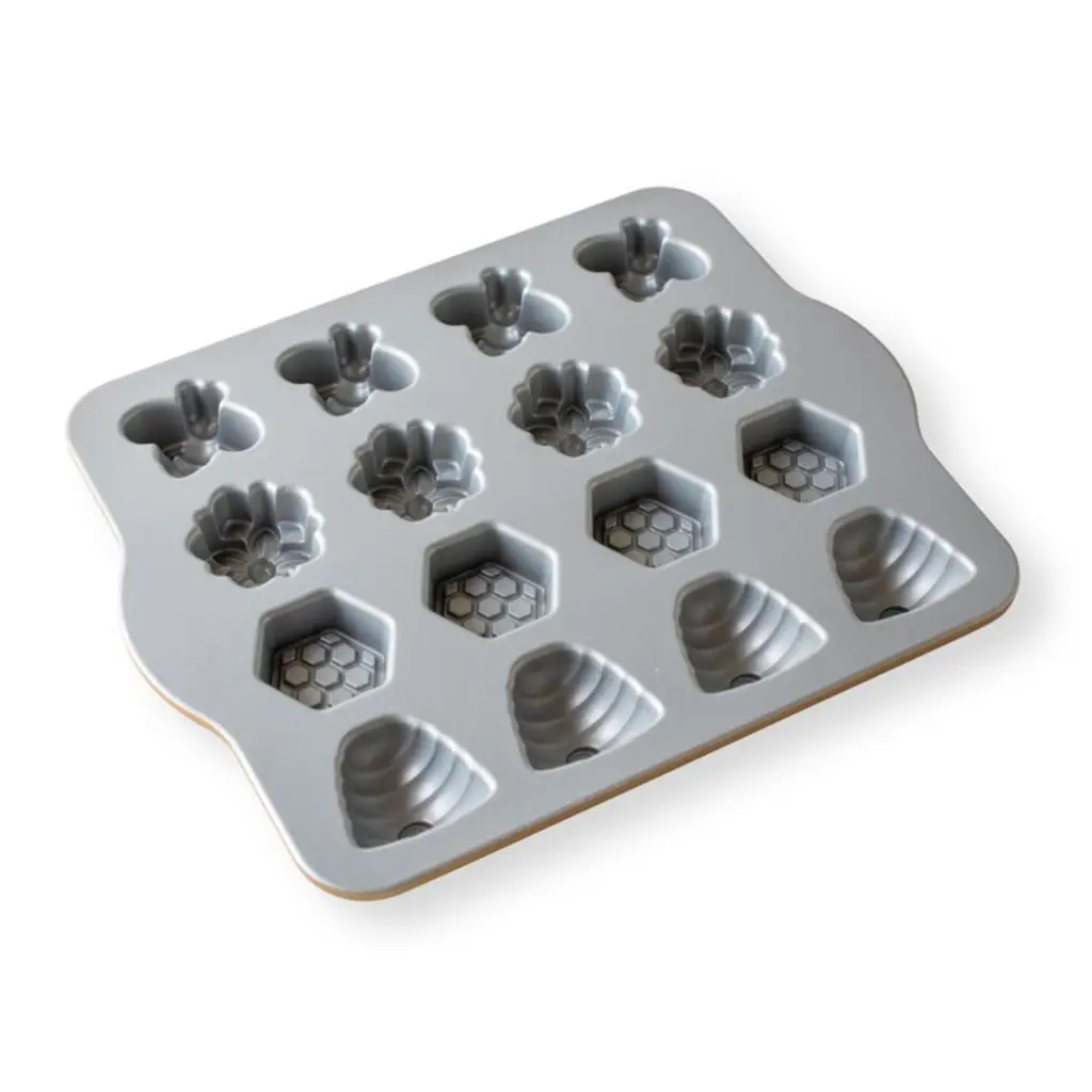Bake petite bee-inspired treats for spring brunches, garden parties and baby showers in this golden pan. Particularly perfect for honey-infused recipes, the pan creates 16 bite-size cakes that are a delightful addition to spring and summer tables. Cast aluminum keeps the details of the bees, flowers, skep hives and honeycombs crisp, while the double layer of non-stick coating ensures a clean, easy release. The charming bitelet pan makes a sweet gift for your favorite baker.Nordic Ware, a family-owned and -operated company, has been making high-quality bakeware for over 70 years.