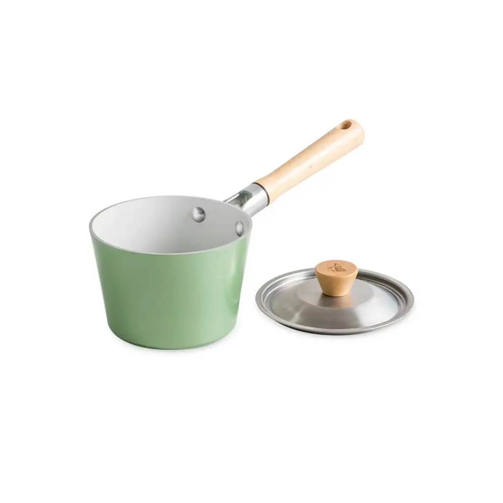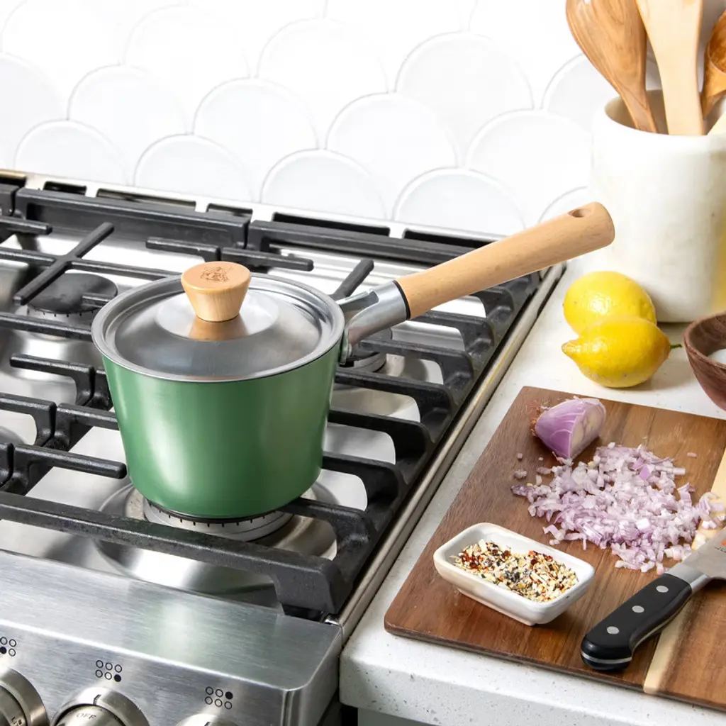 Introducing the Cardamom™ 1.5 Qt Saucepan with Lid – a small pan that packs a punch. Whether you're warming sauces or preparing small batches of grains, its durable spun aluminum body and premium ceramic nonstick interior offer effortless food release and easy cleanup. The Scandinavian-inspired design, complete with a natural wood handle adds a touch of elegance to your kitchen. Plus paired with the 6-inch brushed stainless steel lid and wood knob combines form and function beautifully. Designed for exceptional performance, the saucepan ensures even heating across gas, electric, and ceramic cooktops. Set Includes: 1.5 qt Saucepan with 6 Inch Lid.