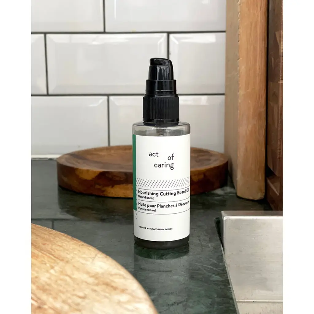 Act of Caring's Nourishing Cutting Board Oil is a gentle and nurturing product designed for keeping your cutting boards and wooden kitchen utensils beautiful for years to come. Containing natural sunflower and macadamia oils, the product keeps all wooden surfaces hydrated and protected, preventing stains and chipping. Made in Sweden, the Act of Caring products are completely plant-based, non-toxic and scented with pure essential oils – perfect for providing gentle care for your beloved items and keeping the surfaces of your home clean without unnecessary chemicals.