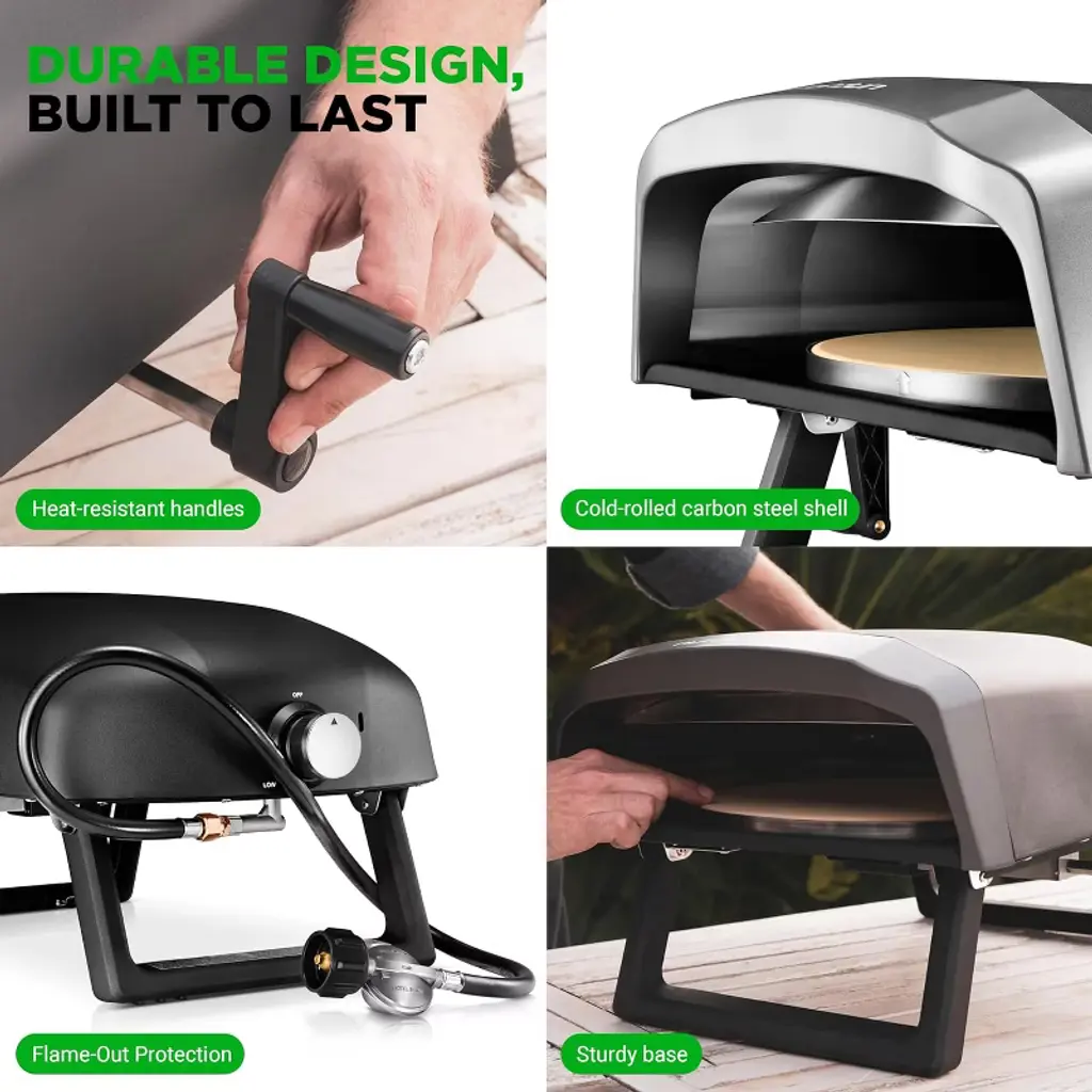Experience the joy of homemade pizza with the NutriChef 360° Portable Pizza Oven. This innovative oven features a 360° rotating pizza stone that ensures an evenly baked, leopard-spotted crispy crust every time. With one-touch gas ignition, you can ignite the heat instantly, cooking a delicious 12” pizza in just 1 minute! The adjustable heat control dial allows for effortless temperature management, making it easy for anyone to achieve perfect results. Designed for convenience, this lightweight and portable oven comes with detachable components for easy transport and storage. Its robust construction, including a cold-rolled carbon steel shell and L-shaped burner, guarantees durability and consistent cooking. Whether you're enjoying a backyard gathering or a cozy indoor night, this pizza oven is perfect for any occasion.