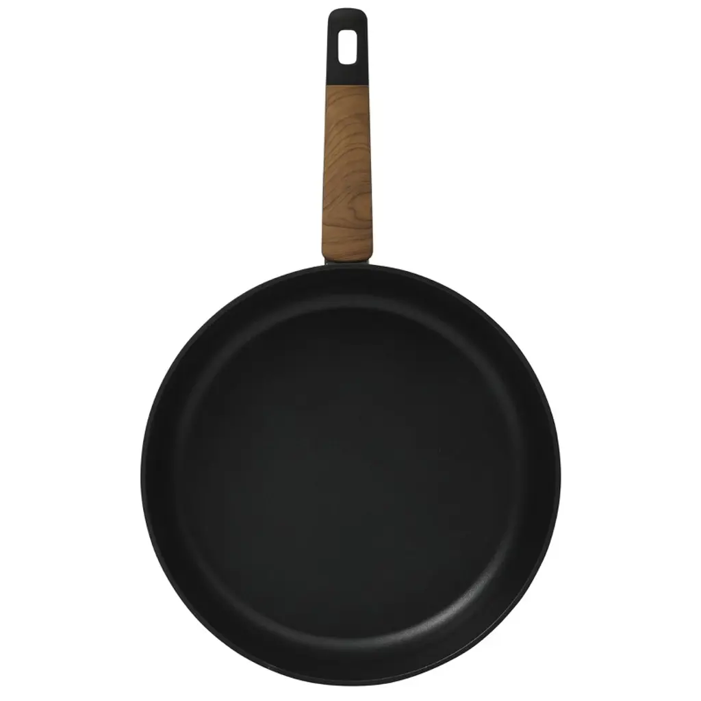 The Oster Oxburg 12 Inch Nonstick Aluminum Frying Pan in Black is a versatile cooking companion. Made from durable aluminum, it ensures excellent heat conductivity for consistent cooking results. The pan features a sleek black finish and a wood print accented handle with a soft grip, providing both style and comfort. This pan is coated with a high-quality nonstick surface for easy food release and cleanup. It is compatible with various stovetops, including gas, halogen, induction, electric, and vitroceramic. Hand washing is recommended to maintain the nonstick coating and overall quality. Whether cooking omelets or searing vegetables, this pan is a reliable addition to any kitchen.