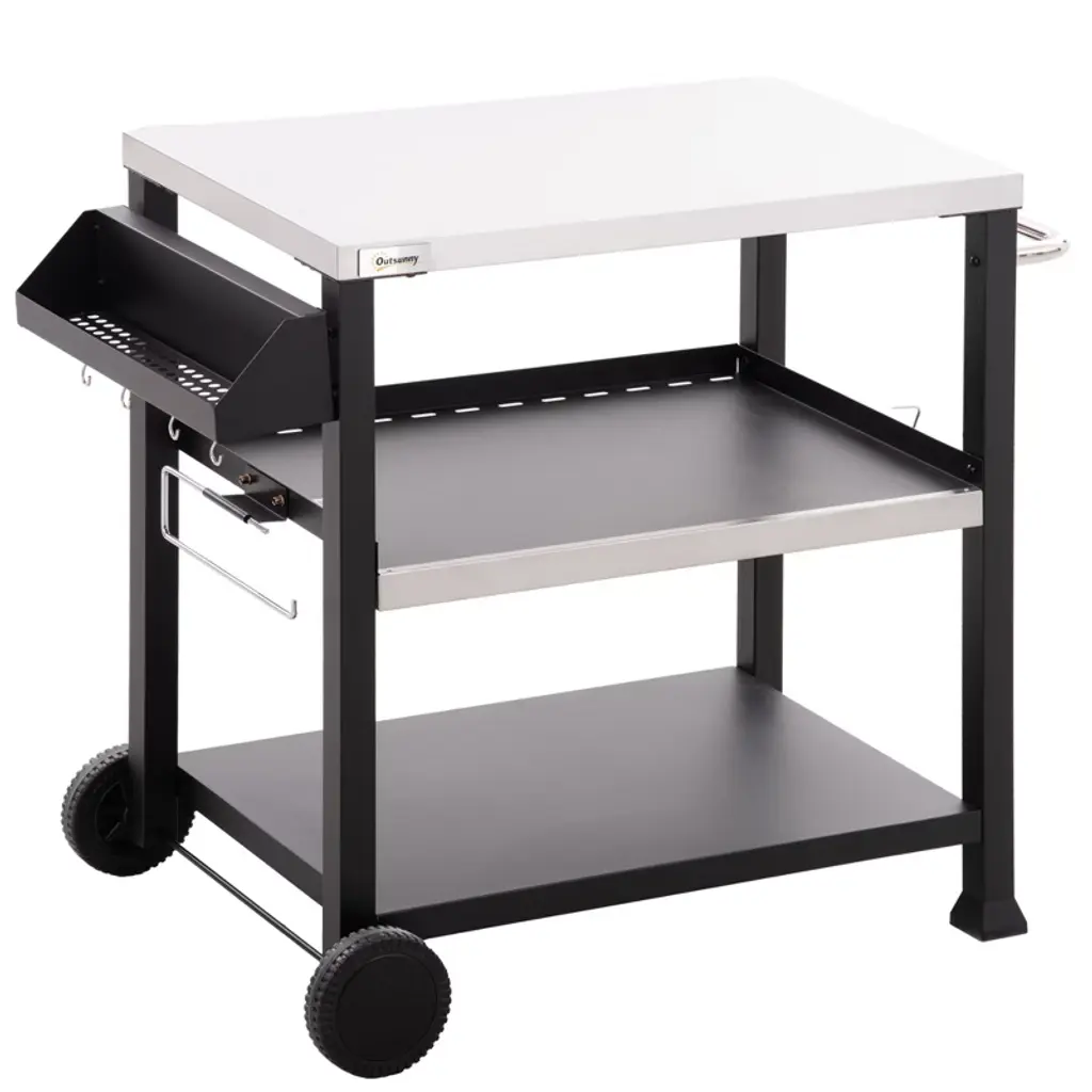 Whether you want a mobile place to put a pizza oven, an outdoor prep station or extra space as you grill an Outsunny outdoor grill cart can do it. It has a large stainless steel surface that wipes clean and space for food, plates, or cleaning supplies below. 4 hooks hold utensils. There's a spice rack for seasonings, a spot for paper towels, and trash bags, so everything can be done in a single spot. Whatever you want to make mobile outside, this outdoor grill table can. Get out, with Outsunny.