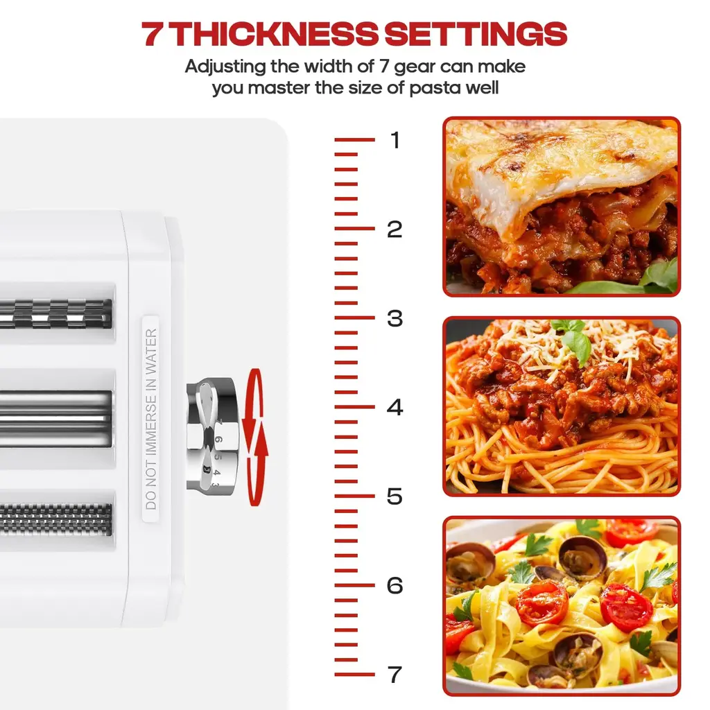 Pasta Attachment: The Pasta Maker offers versatility with Pasta Roller,Spaghetti Cutter,Fettuccine Cutter. The all-in-one design of this pasta machine saves time and labor; completes all three steps at the same time without having to switch between pasta roller. With this multifunctional 3-1 Pasta Maker Machine, you can easily serve fresh homemade pasta and noodles to family and friends in minutes and enjoy the convenience of making fresh pasta and noodles Food-grade materials: The 3-in-1 Manual Pasta Maker Machine blades are made of food-grade aluminum alloy, which is very durable.Manual pasta maker wear-resistant plastic, ensuring a sturdy and compact design. The Pasta Sheet Roller, Spaghetti Cutter, Fettuccine Cutter provide consistent power, all-in-one design sturdy construction and convenient features for an unrivaled pasta making experience 7 thickness settings:Enjoy homemade pasta with the 3-in-1Manual Pasta Maker Machine.The pasta maker has 7 thickness dough roller settings ranging from 0.4 mm to 2 mm, change the texture and flavor of your pasta with a simple turn of the adjusting button, making it easy to create pasta of your desired thickness. Made of precision aluminum gears, this noodle maker works efficiently and quietly to create spaghetti, fettuccine, dumpling,lasagna, ravioli, by continuously pressing down on the thickness of the dough for all your pasta-making needs Main unit base:The host base of this manual pasta maker is made of high quality plastic material to ensure long lasting durability and stability. The hand crank arm is removable and the super suction base allows the dumpling maker to stay firmly on the tabletop, preventing it from sliding or moving during use. To ensure optimal performance, use this noodle maker machine on a smooth, flat glass or ceramic tabletop for even greater suction, which will help ensure that the pasta maker remains stable and secure throughout the working process Easy to use and clean:Upgrade your kitchen and instantly enjoy the convenience of a high-quality manual pasta maker. 3-in-1 multifunctional design, seven thickness adjustment buttons, premium materials, a removable hand crank arm and a super suction base, this set of pasta maker machine is a must-have for any cooking enthusiast. To clean, open the lid and use the included brush with ease. Note: Do not wash in the dishwasher and avoid immersion in water. For your peace of mind, this manual pasta machine comes with a 1-year after-sales service