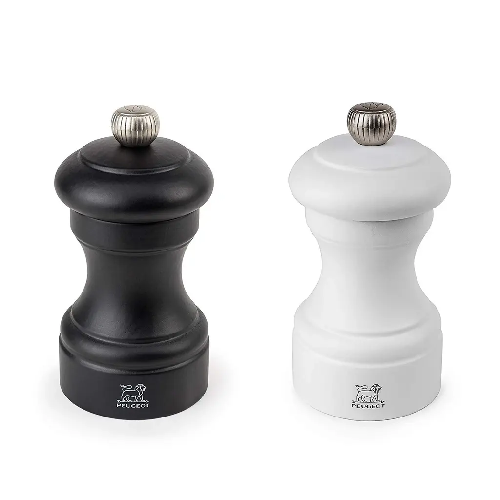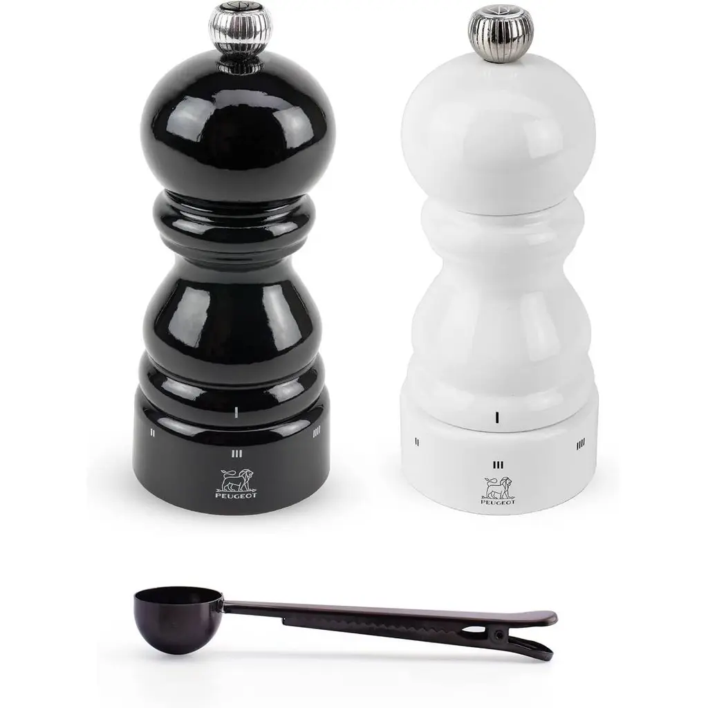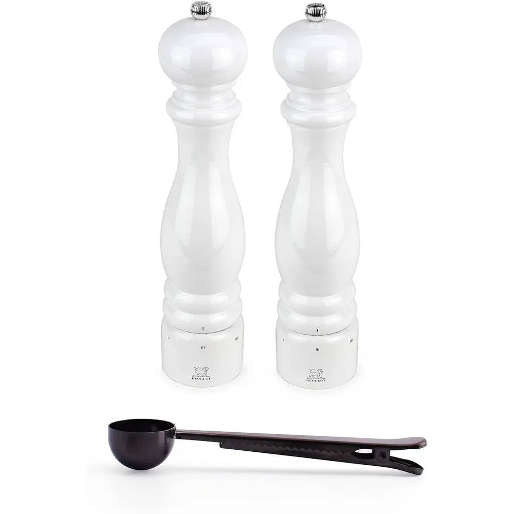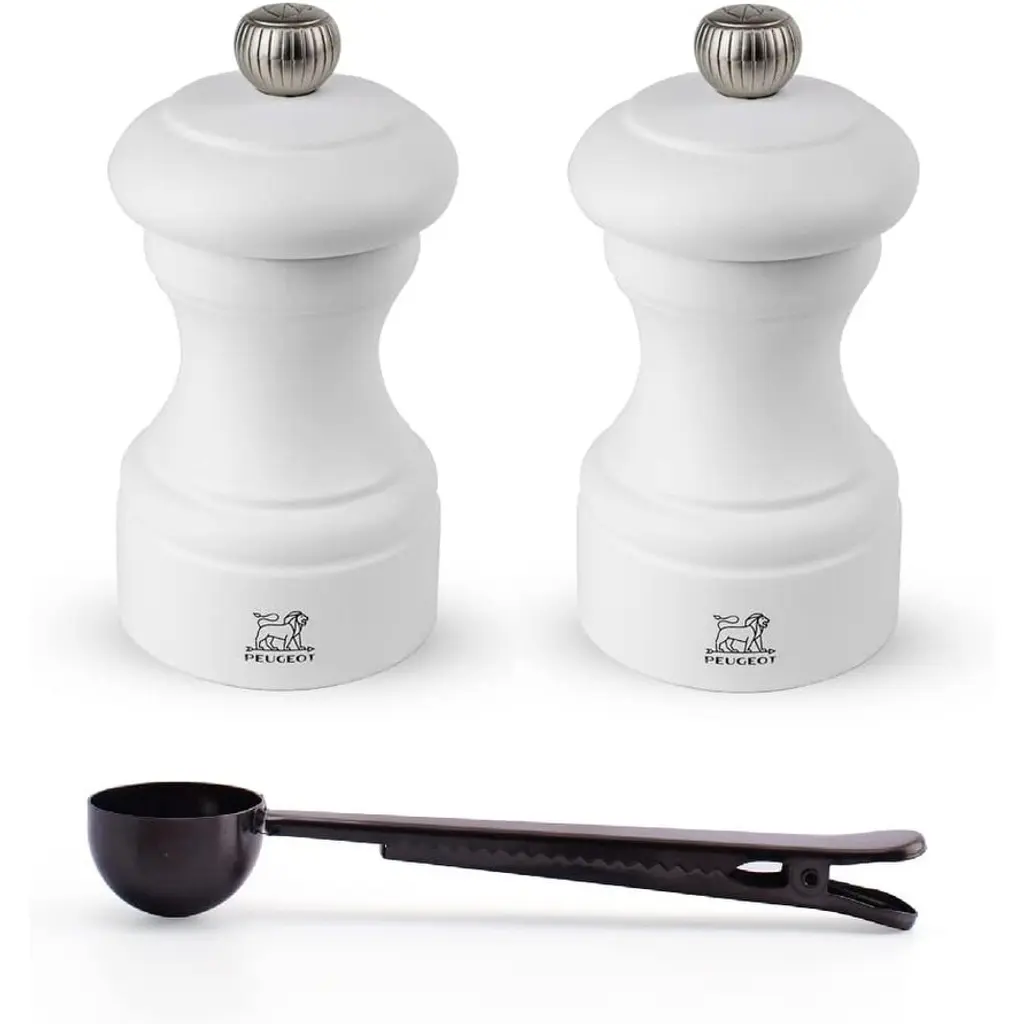 Peugeot Bistro 4 Inch Salt & Pepper Mill Gift Set, Matte White & Black - With Stainless Steel Spice Scoop/bag Clip - Multi - 3 Piece