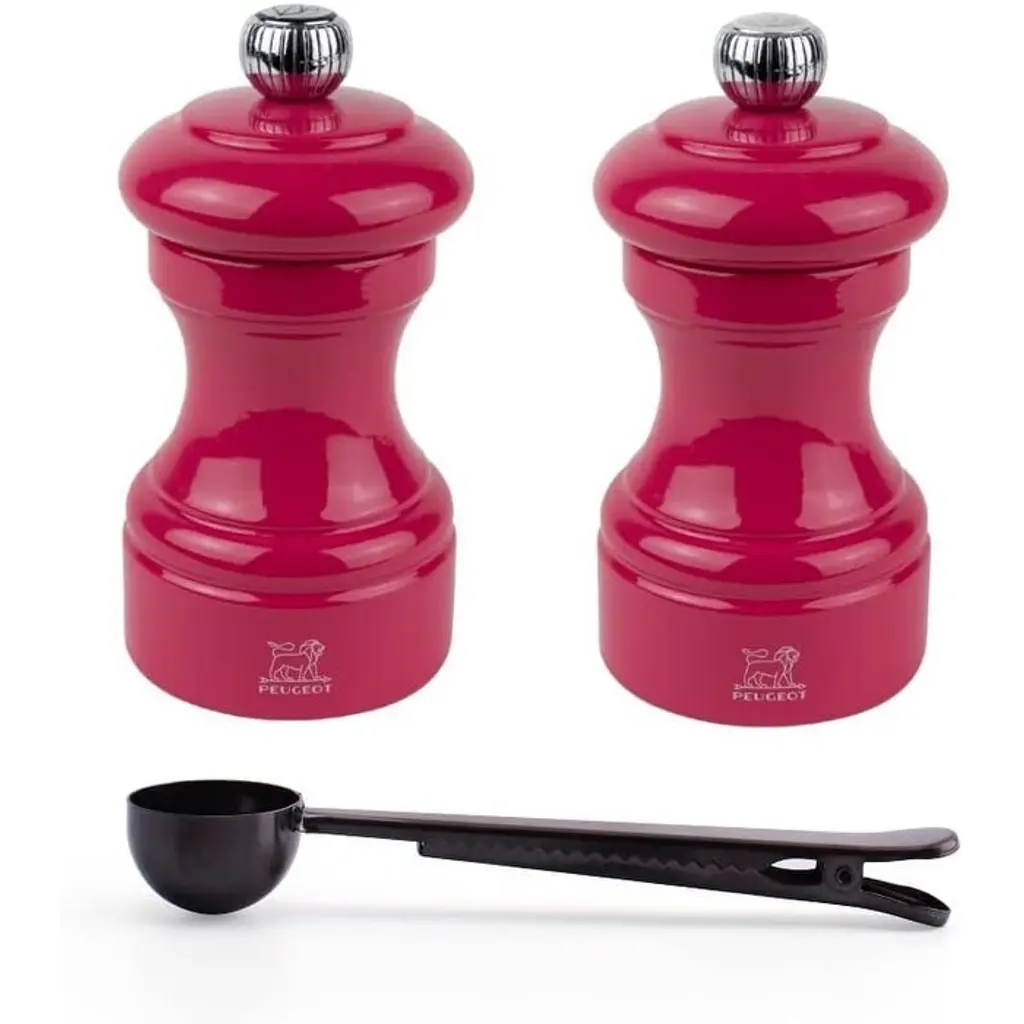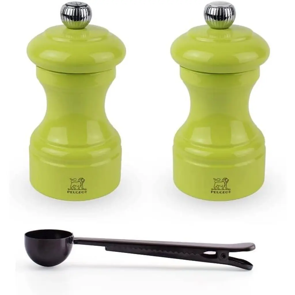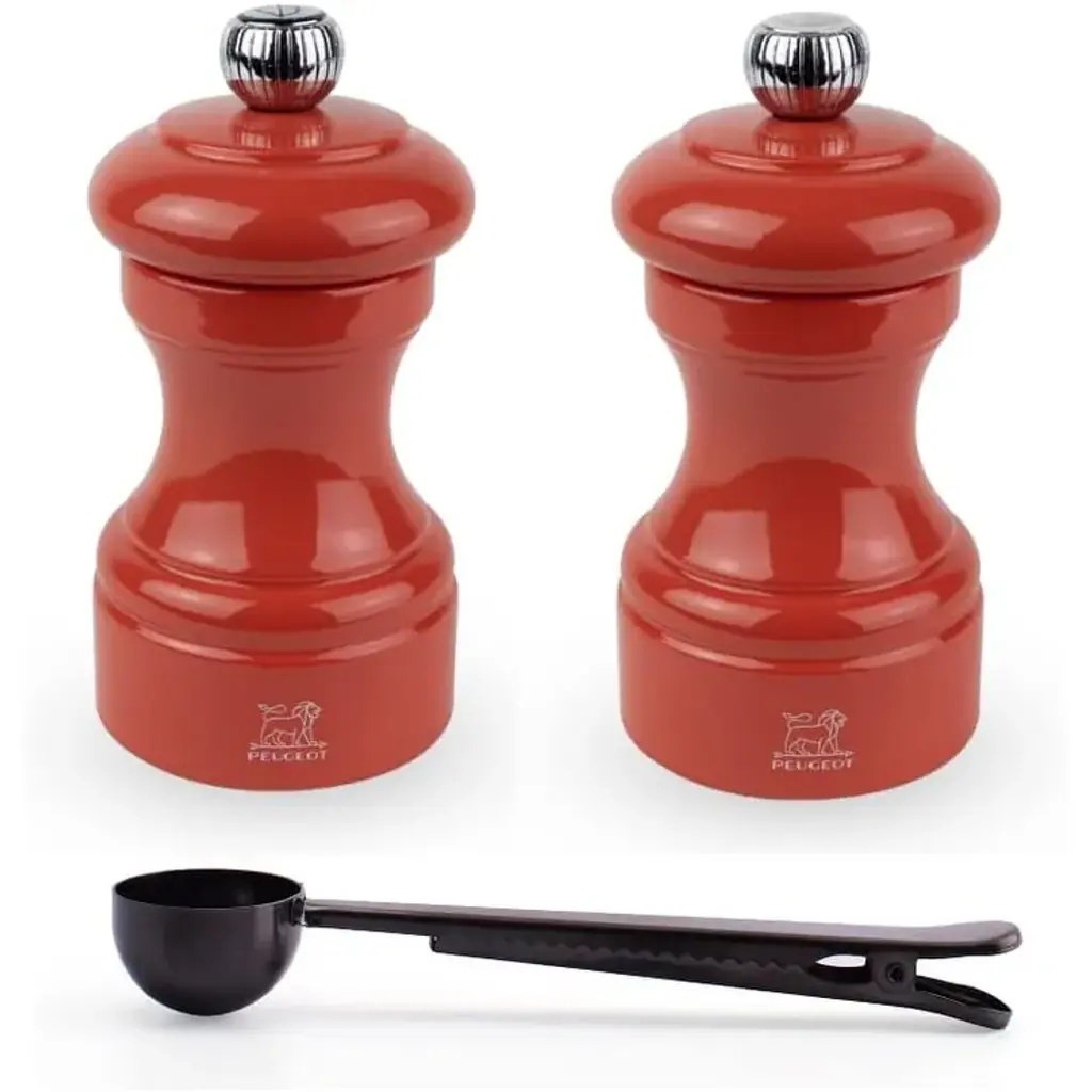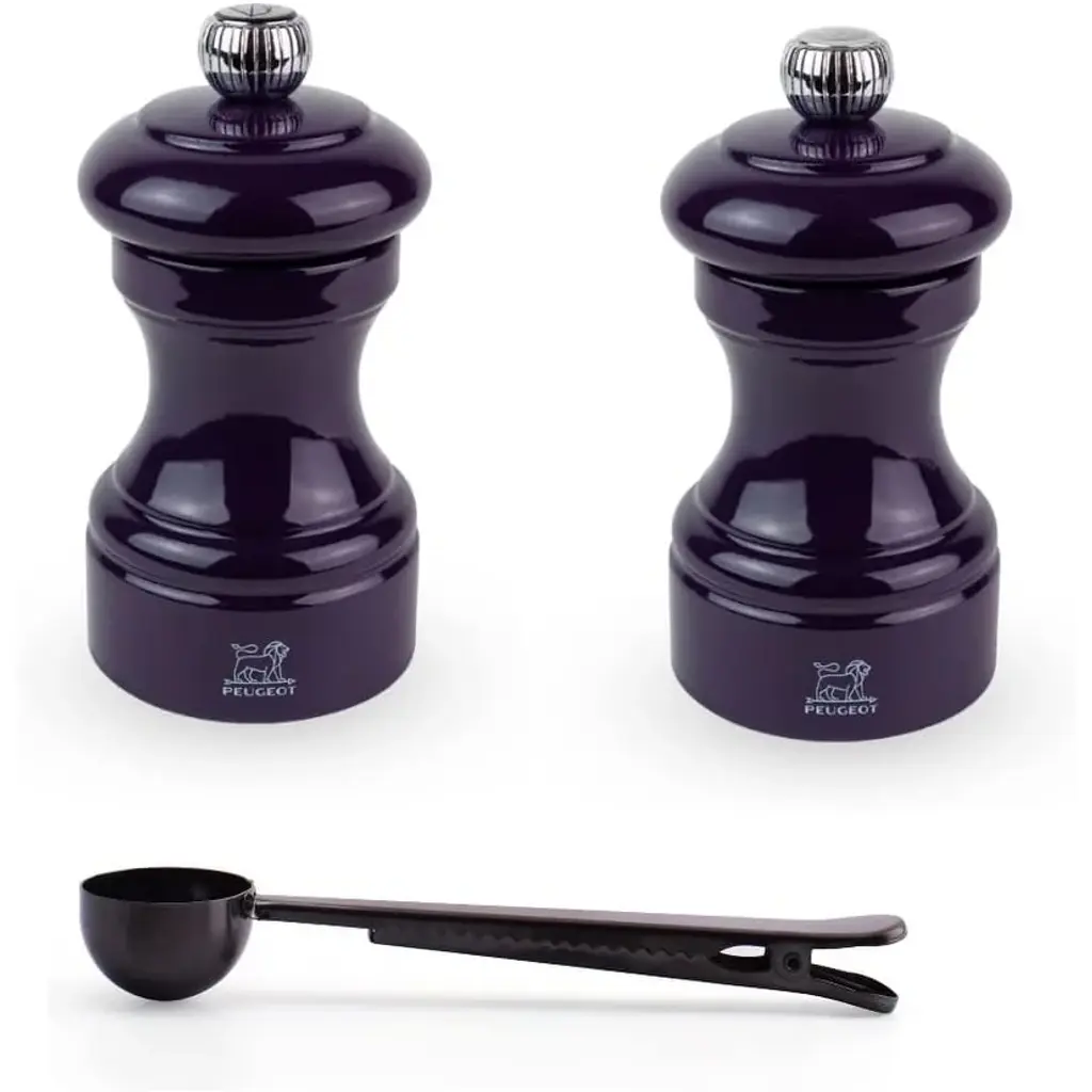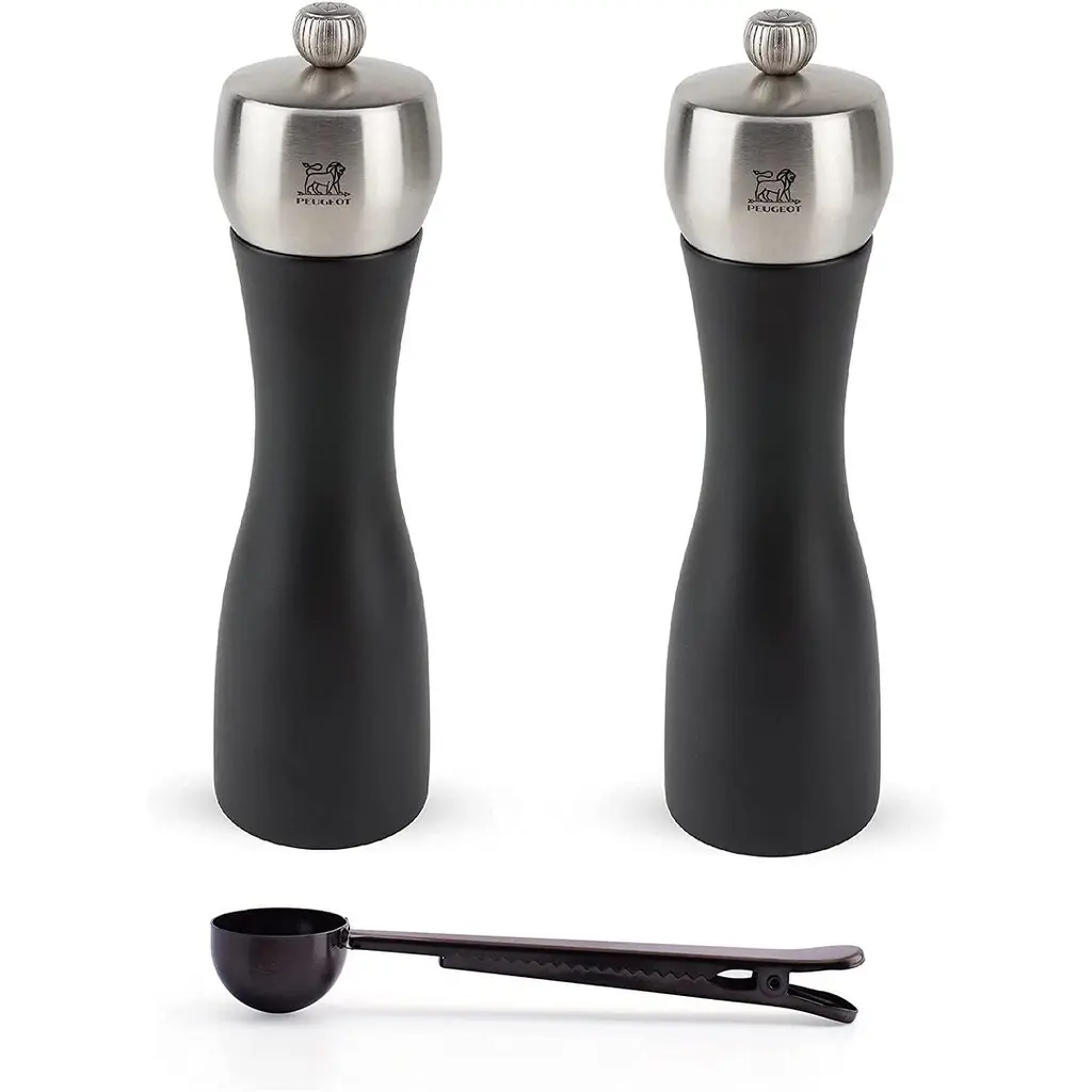 Peugeot Bistro 4 Inch Salt & Pepper Mill Gift Set, Matte White & Black - With Stainless Steel Spice Scoop/bag Clip - Multi - 3 Piece
