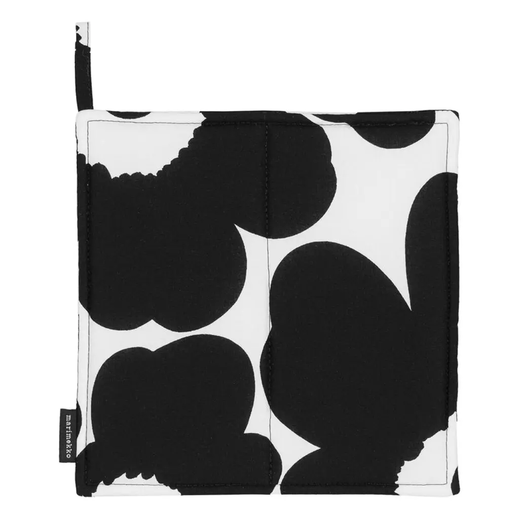 Marimekko’s Pieni Unikko oven mitten features Maija Isola’s iconic floral pattern in shades of unbleached cotton and peach. The padded oven mitt has a convenient hanging loop, and it is suitable for both right- and left-handed home cooks. The Unikko pattern came about in 1964 after Armi Ratia, the founder of Marimekko, had announced in public that no floral fabrics are designed at Marimekko. Maija Isola did not accept rules or restrictions and designed in protest a complete collection of bold floral patterns: Unikko, a Finnish word that means poppy. Today, Unikko is one of Marimekko's best-known patterns and is recognized worldwide.