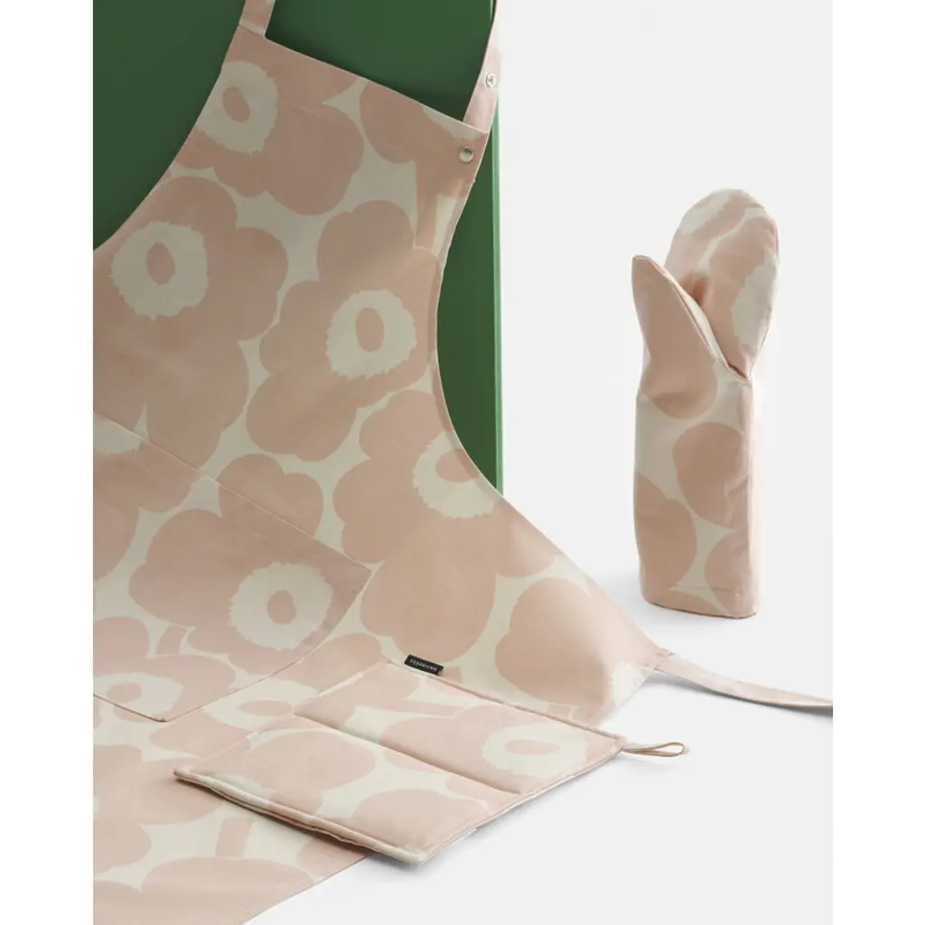 Marimekko’s Pieni Unikko pot holder features Maija Isola’s iconic floral pattern in shades of unbleached cotton and peach. The pot holder is made of padded cotton-linen fabric, and it has a convenient hanging loop. The Unikko pattern came about in 1964 after Armi Ratia, the founder of Marimekko, had announced in public that no floral fabrics are designed at Marimekko. Maija Isola did not accept rules or restrictions and designed in protest a complete collection of bold floral patterns: Unikko, a Finnish word that means poppy. Today, Unikko is one of Marimekko's best-known patterns and is recognized worldwide.