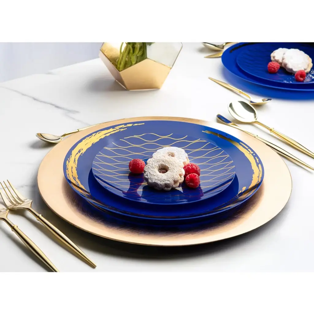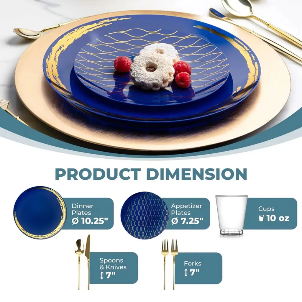 Posh Setting Elegant Blue and Gold Disposable Dinnerware Bundle offers the ultimate convenience for hosting upscale events. This all-inclusive set features dinner plates, salad/appetizer plates, 10oz clear hard plastic cups, spoons, knives, and double forks per setting, all in a refined Blue and Gold design. Ideal for weddings, parties, and upscale gatherings, ensuring easy cleanup.
