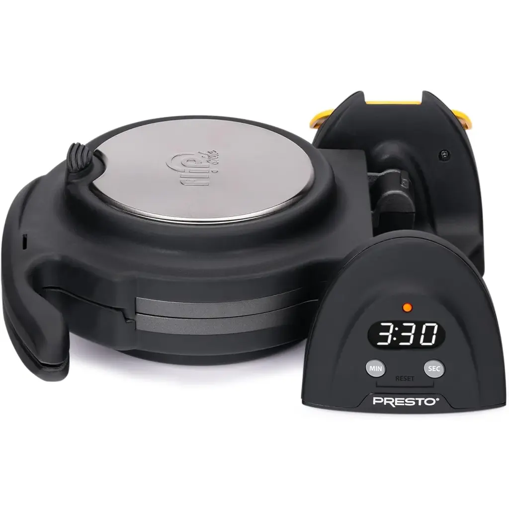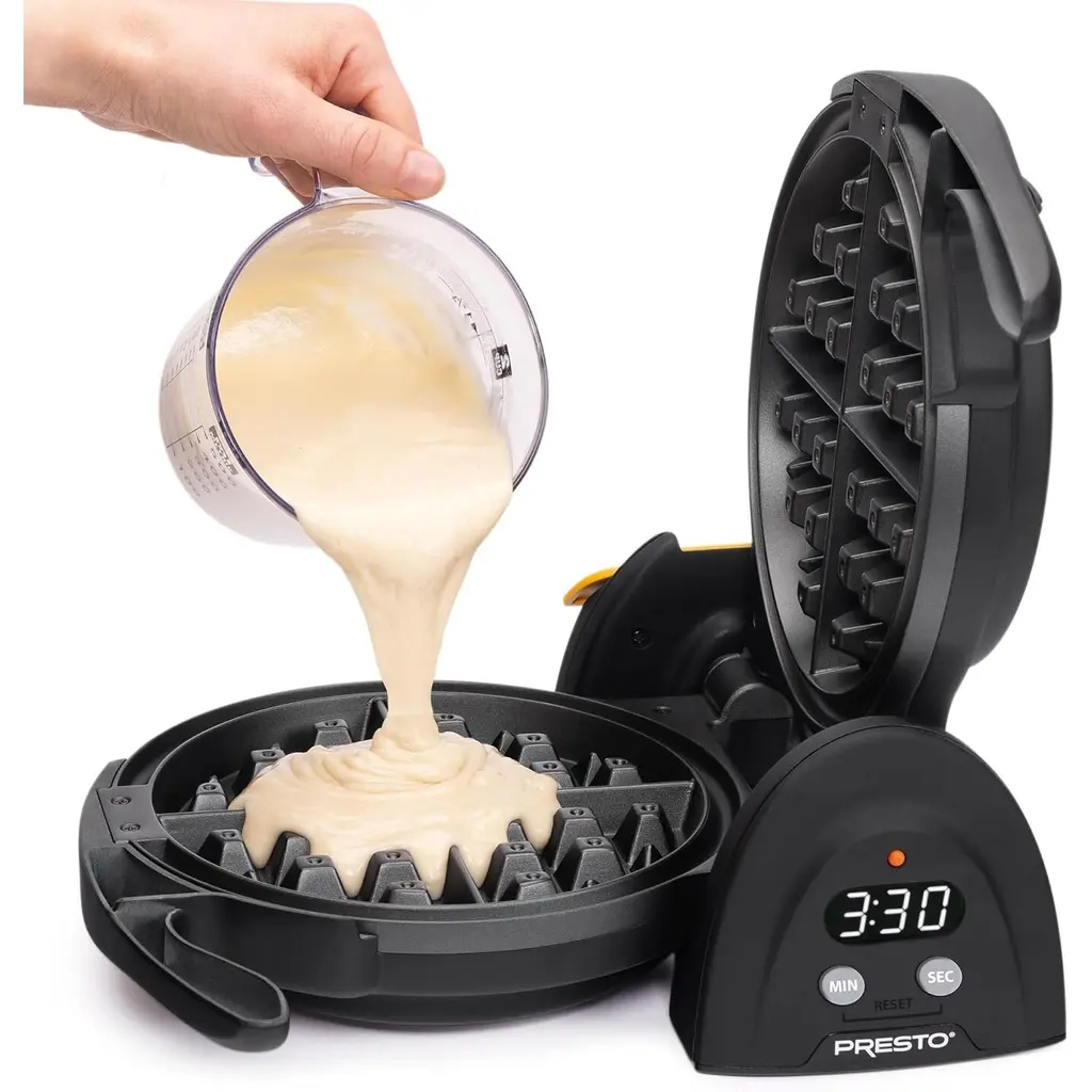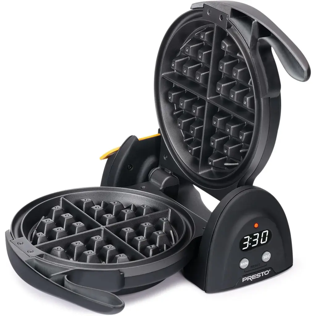 Flipside Belgian Waffle Maker. Professional-style rotating design bakes extra-thick Belgain waffles in minutes. Flips over side to side to evenly spread batter. Dual-function base locks in vertical position for easy storage. Ceramic non-stick surface- PFAS Free. FlipSide Belgian Waffle Maker with Digital timer. Waffle maker flips over side to side to evenly spread batter. Bakes Belgian waffles that are crispy outside and fluffle and tender inside. Extra-thick grid makes 7-inch diameter waffle that can be divided into four easy-to-cut sections. Countdown timer with LED digital display signals when baking time is up. Ceramic non-stick interior wipes clean. PFAS Free. Dual function base with cool-touch handles enable convenient rotation. Latch locks the waffle maker in a vertical positioni for compact storage.