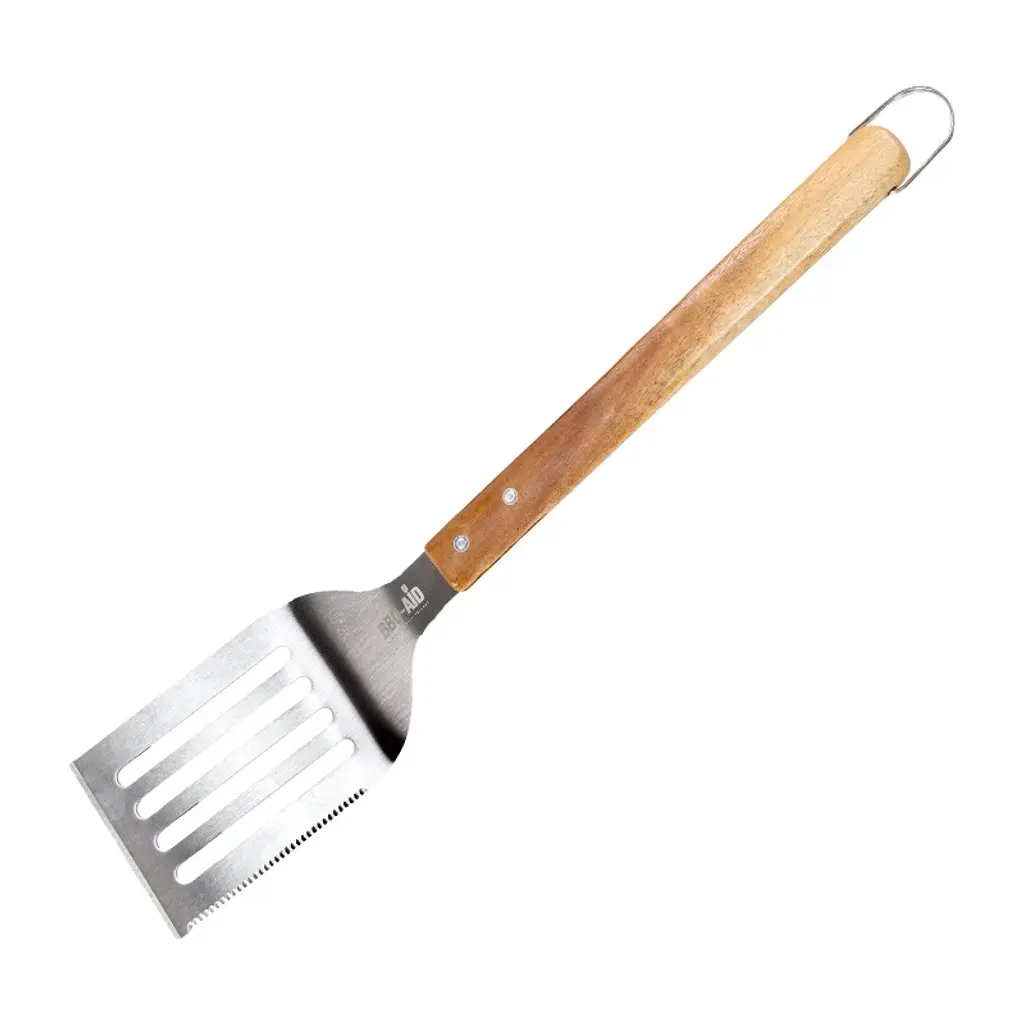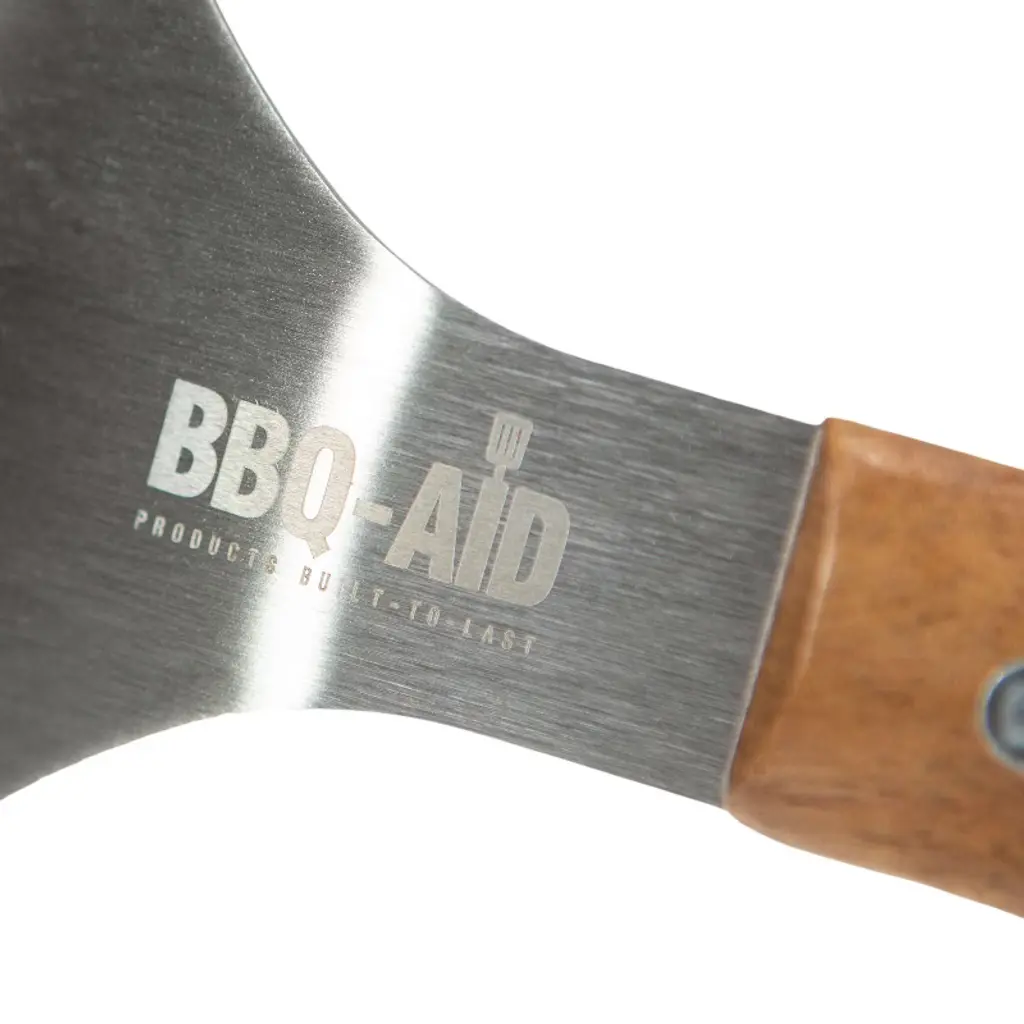 The BBQ-AID Pro BBQ Spatula is a tool that can take the heat and won’t let you (or your food) down. The wide blade can flip anything on the grill and the solid, durable acacia handle keeps your hands out of the heat. BBQ-AID is excited to introduce our all new Pro BBQ Spatula just in time for the 2022 grilling season! The stainless-steel construction is durable and dishwasher safe. With and extra large turner and serrated knife edge, the Pro BBQ Spatula is built to perform. No more burns as our extra-long handle keeps your hands away from the grill surface. Built to last with beautiful acacia wooden handles which are beautiful and safe.