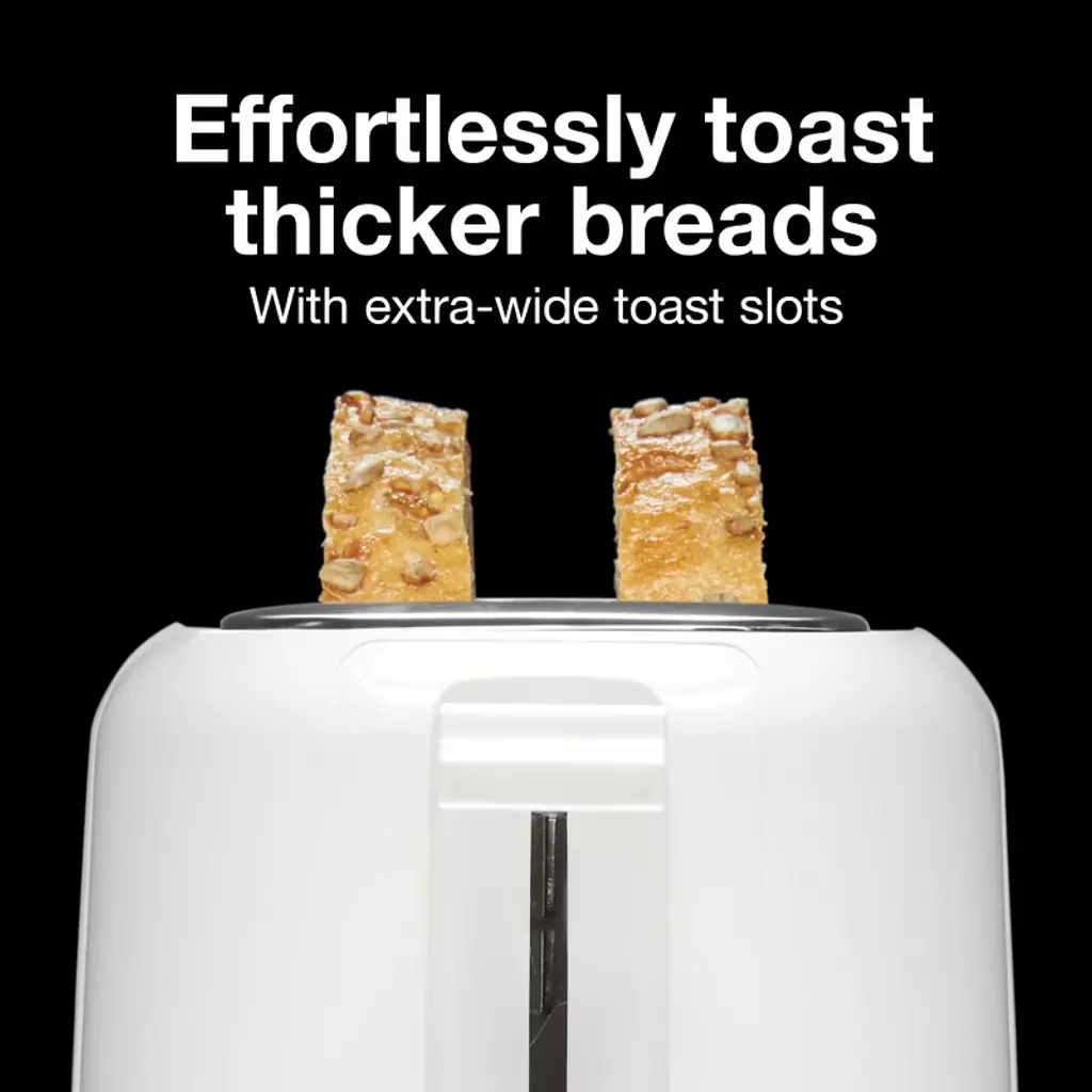 The Proctor Silex® Wide-Slot 2 Slice Toaster has wider slots to easily toast your favorite thickly-sliced breads and bagels. Toast Boost lifts smaller breads so they're easier to retrieve. Easy to clean with pullout crumb tray. Built-in cord wrap.Effortlessly Toast Thicker Breads The toast slots are extra wide to easily fit thicker breads and bagels.Easily Retrieve Smaller-Sized Breads Toast Boost lifts smaller breads like English muffins so they're easier to retrieve after toasting.Keep Countertops Cleaner Conveniently remove and discard crumbs from the bottom of the toaster with the pullout crumb tray, so they don't end up on your countertop.Customize Your Toast Shade Use the shade selector to make lighter or darker toast. Choose from 7 toast shades. Simply press the cancel button to stop the toast cycle and get your toast. No need to wait!Neatly Stores Away The built-in cord wrap in the base of the toaster makes it easy to neatly store the toaster when it's not being used.Auto Shutoff for Peace of Mind The toaster automatically shuts off at the end of the toasting cycle, even if toast gets jammed.Backed by Proctor Silex The toaster is backed by Proctor Silex with a 3 year limited warranty.