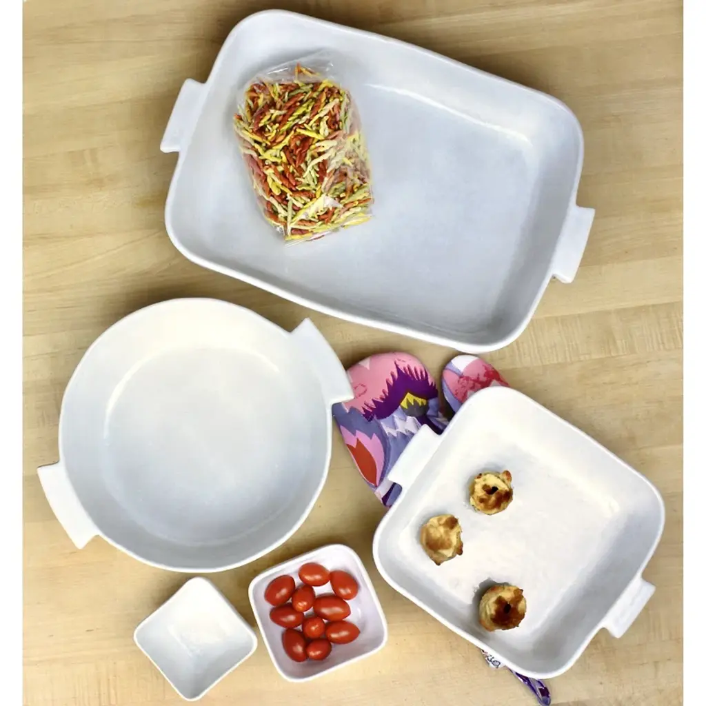 Cozina serving pieces have that "fit anywhere" look to complement any decor. Our beautiful round baker goes from freezer to oven to table. Measures 9" in diameter inside and 3" deep. Handles on both sides for easy maneuvering. Holds 3 qts. The blue baker is durable ceramic stoneware with our signature, softly sponged glaze. Made in Portugal. The dishwasher and microwave are safe. The oven is safe at 475 degrees.