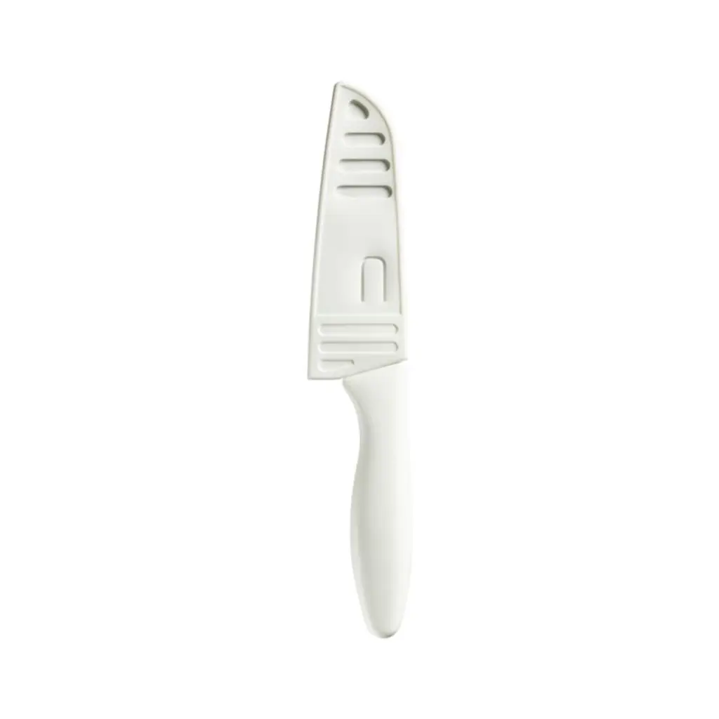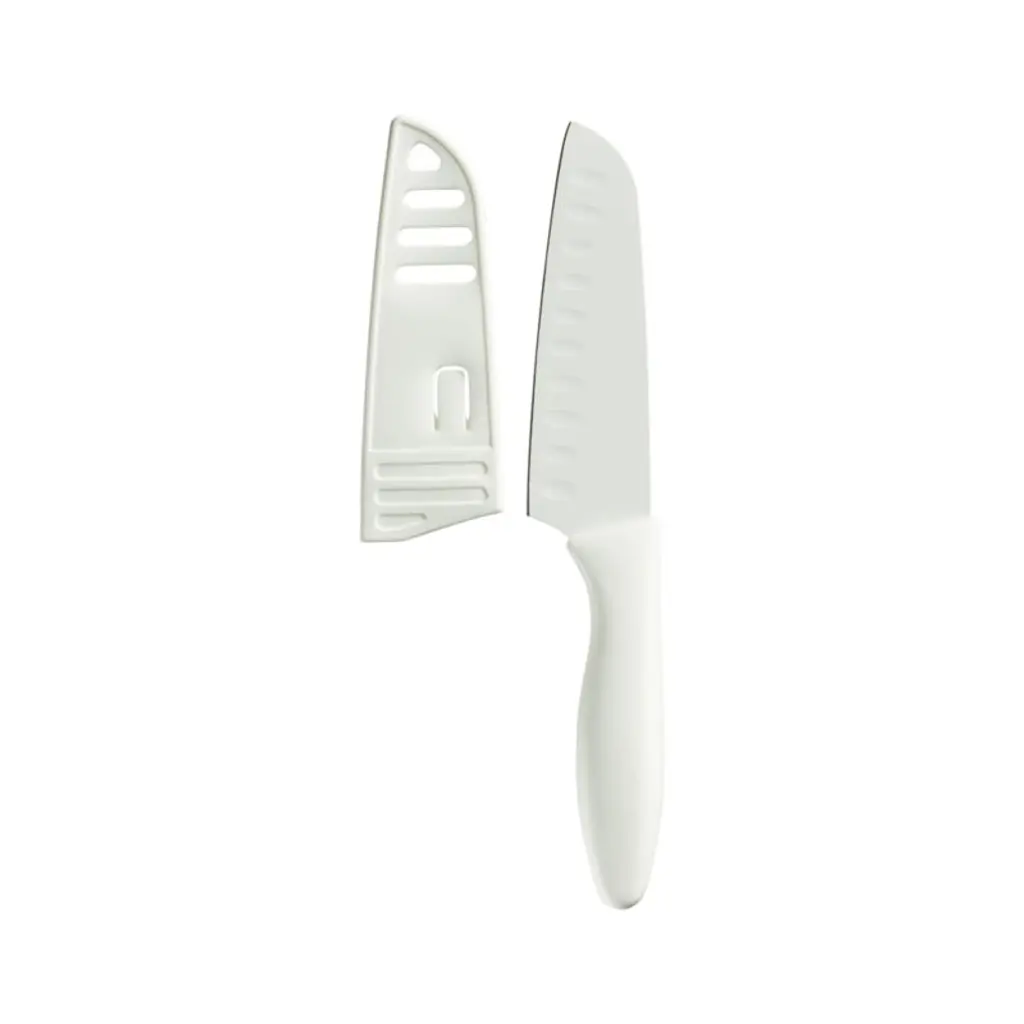 This sheathed, santoku-style knife has a nonstick, high-carbon steel blade for all-purpose paring, peeling and slicing. The covered blade keeps it safe in the drawer or picnic basket. Safety guard adds protection for kids. Need help choosing? Here's your essential guide to choosing the best knife