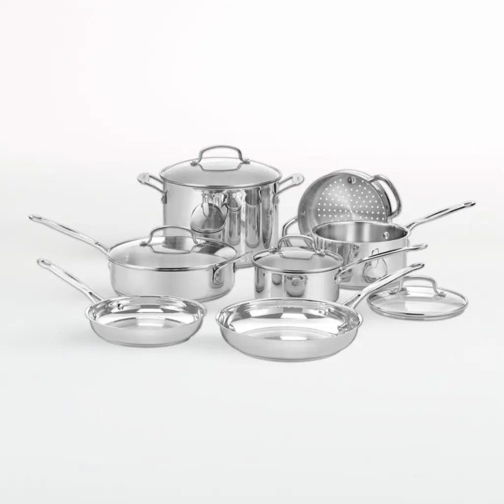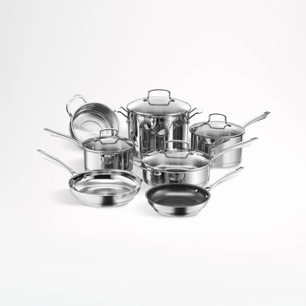 Outfit your kitchen for cooking everyday meals and festive feasts with this 10-piece set of essentials. Crafted of stainless steel, the non-reactive pans offer strength, durability and even heat distribution. Cast stainless steel handles stay cool as you cook, while glass lids trap heat and moisture on the stove or in the oven. An excellent housewarming, graduation or engagement gift, this cookware set includes 8- and 11-inch frying pans, 2- and 3.5-quart saucepans with lids, 4-quart saute pan with lid and 11-quart stockpot with lid.