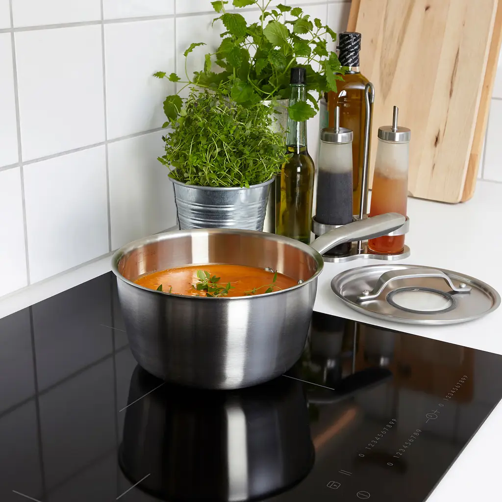 SENSUELL Saucepan with lid - stainless steel/gray 2.5 qt. The lid has a glass window that allows you to monitor the contents of the pot during the cooking process. The handle provides a comfortable and secure grip because it follows the contours of your hand and has silicon on the underside.