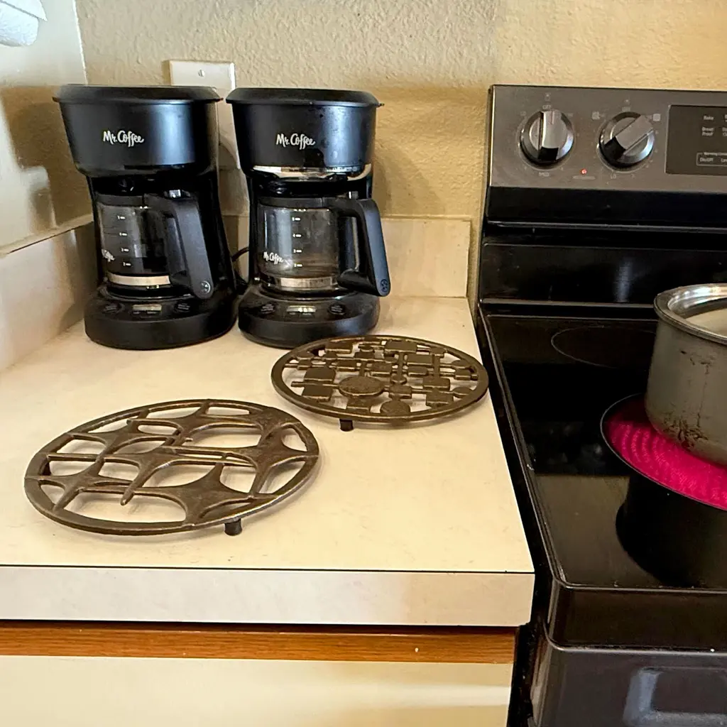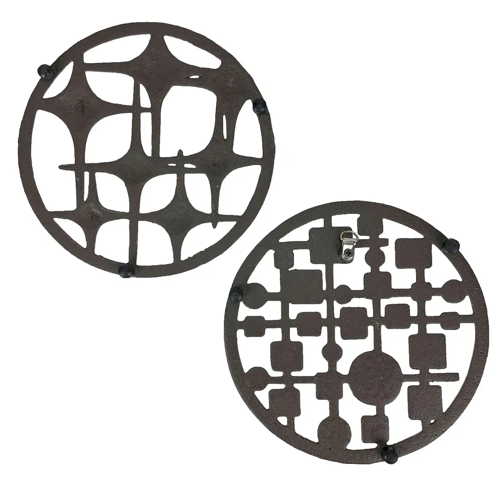 Elevate your dining experience with this Set of 2 Cast Iron Mid Century Modern Trivets, featuring both the iconic Stars and Circles & Squares designs. Each trivet is crafted from heavy-duty cast iron with a classic bronze finish, providing reliable heat resistance and protecting your countertops or tables from hot dishes. The bold, openwork geometric patterns bring authentic retro flair and visual interest to any kitchen or dining space. Non-slip rubber feet ensure stability and surface safety. Perfect for modern or eclectic décor, this set is ideal for entertaining, everyday use, or gifting to design lovers and collectors