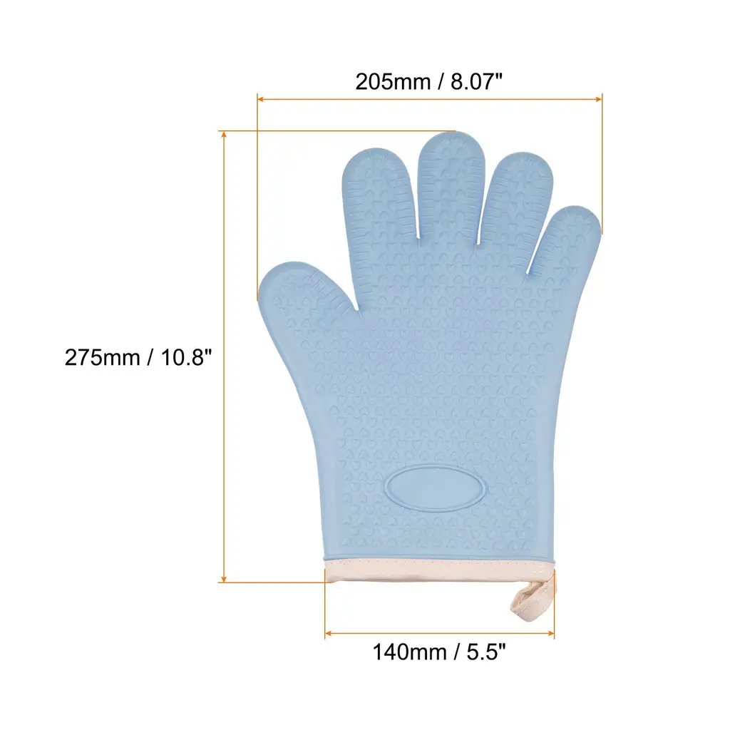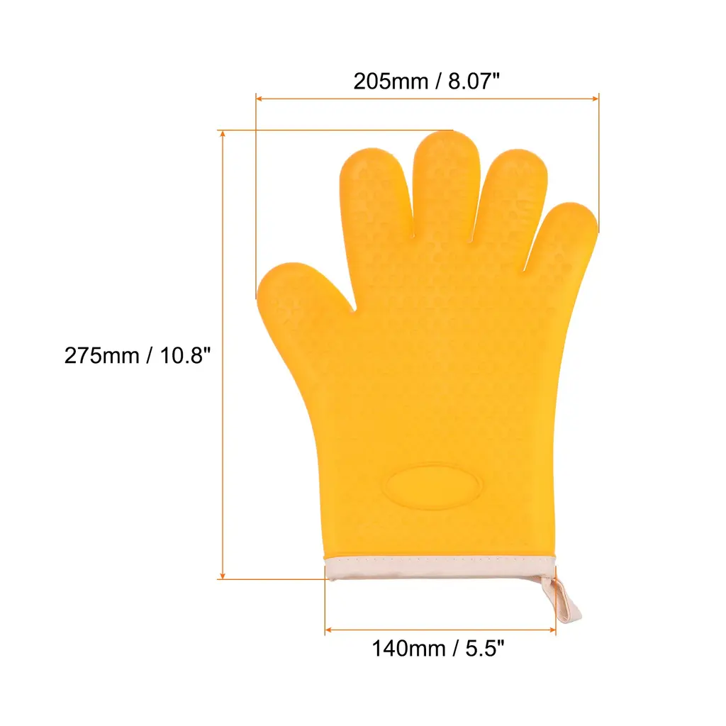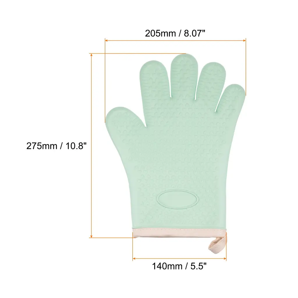 The outer layer of soft silicone oven gloves is made of heat-resistant silicone material to provide high-temperature protection, and the built-in insulating cotton cloth increases heat insulation and comfort, achieving double-layer protection.Oven mitts are designed with a dimpled, textured surface to provide a secure grip on pots, pans and other kitchen tools and prevent slips or accidents when handling hot dishes in the oven or stove.The silicone material makes the oven mitts easy to clean, just rinse them with running water or wipe them with a damp cloth, and they are also dishwasher safe, saving you time and energy in keeping them clean.This oven mitt features convenient hanging holes for easy storage and access when needed, hang it on a hook or display it within easy reach in the kitchen, ensuring quick access.Oven mitts provide reliable protection for a variety of hot surfaces and appliances, including ovens, hot pots, microwaves and grills, which is suitable for cake shops, grills, pizzerias, bakeries or home use, they allow you to handle hot items safely and confidently to minimize the risk of burns.