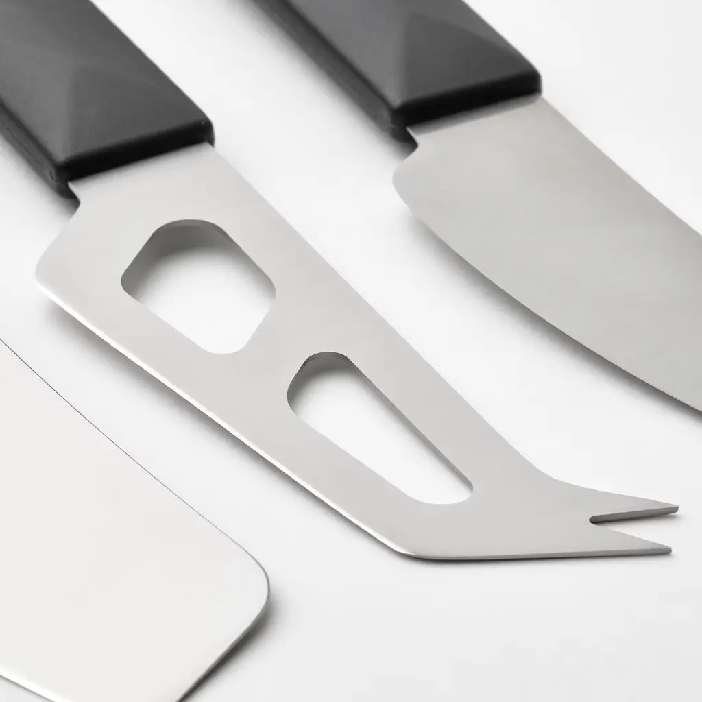 SKÄRLÅNGA Cheese knife set of 3 - stainless steel/black. SKÄRLÅNGA cheese knives have a clean-lined and simple design that suits any cheese tray. The 3 knives in the set are specially suitable for different cheeses – hard, semi-hard and soft.