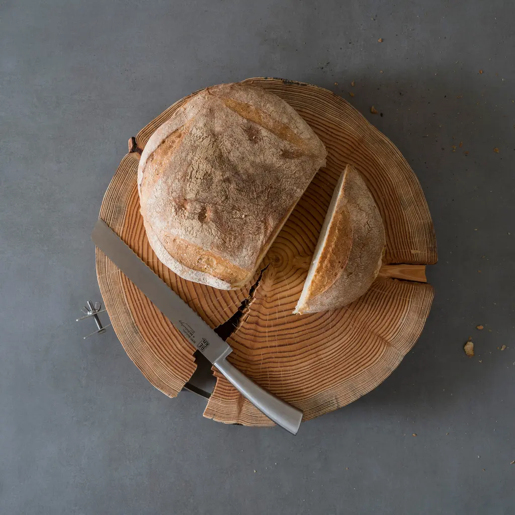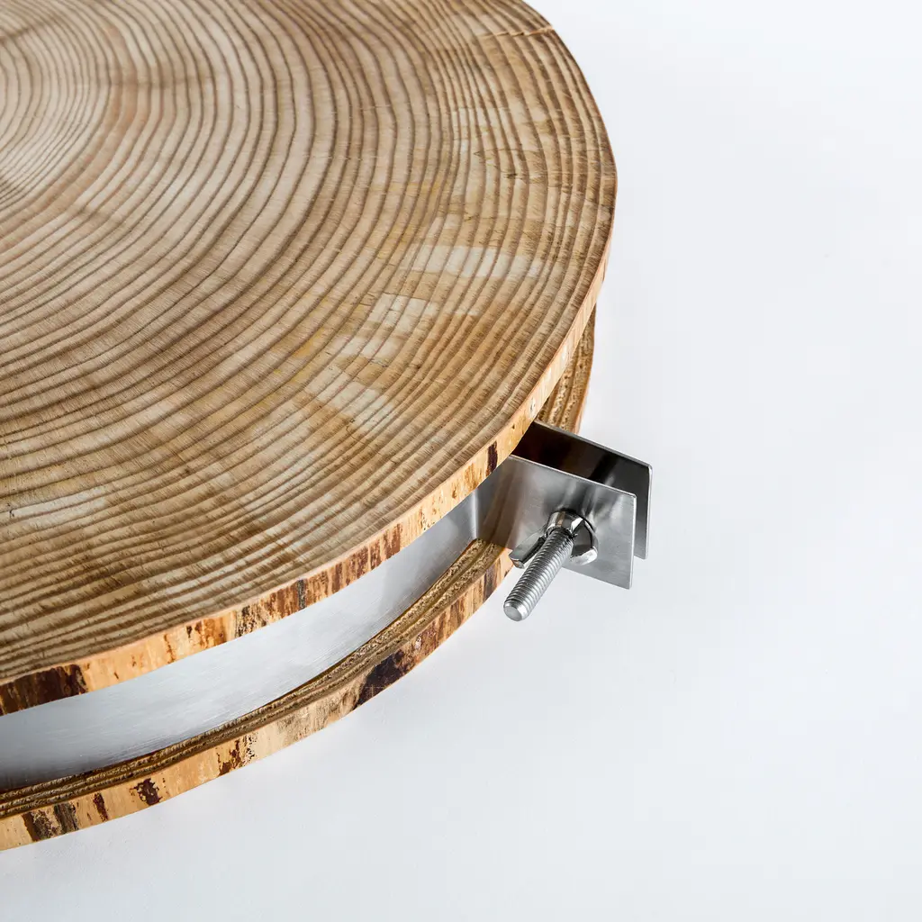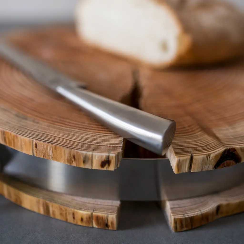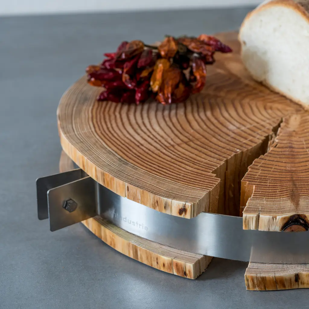 Cut straight from the trunk, S/LAB keeps the essence of the tree intact. This larch wood cutting board from KnIndustrie doesn’t reinterpret tradition—it commits to it. Designed as a raw, circular cross-section, the piece reveals its origins without filter: exposed growth rings, visible age, natural grain, slight irregularities. The steel band that runs its perimeter isn’t decorative—it’s structural, reinforcing the board while framing its elemental shape. At 40 cm in diameter, S/LAB is large, weighty, and stable. It turns daily prep into something more grounded. The surface—dense but forgiving—preserves your knife’s edge far better than plastic or overly hard composites. As the blade moves across the end grain, the fibers gently give and close back up, keeping things sharp and clean. Larchwood is naturally antibacterial, moisture-resistant, and built to last if cared for well. Over time, it gains character. Oil it, use it, leave it out on the counter—this is the board that gets better the more you work with it. A piece that speaks less of trends, more of permanence.