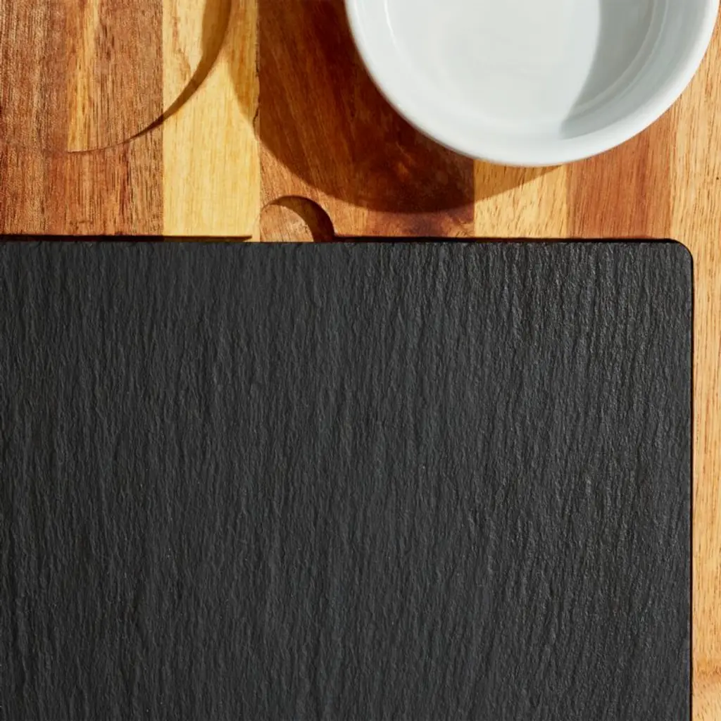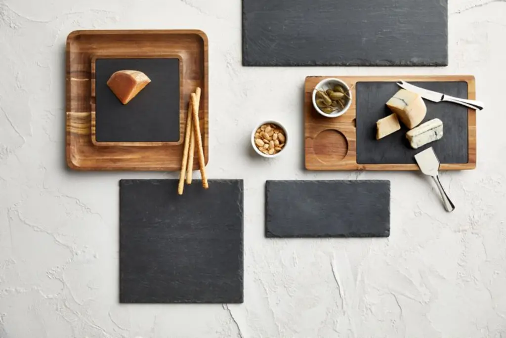 This handsome design unites warm acacia wood and cool slate in a serving board that optimizes serving options. The board serving features recessed slots for two ceramic appetizer bowls and slate board that remove to let you expand the spread and facilitate passing.By choosing FSC®-certified products, you are supporting responsible management of the world's forests.