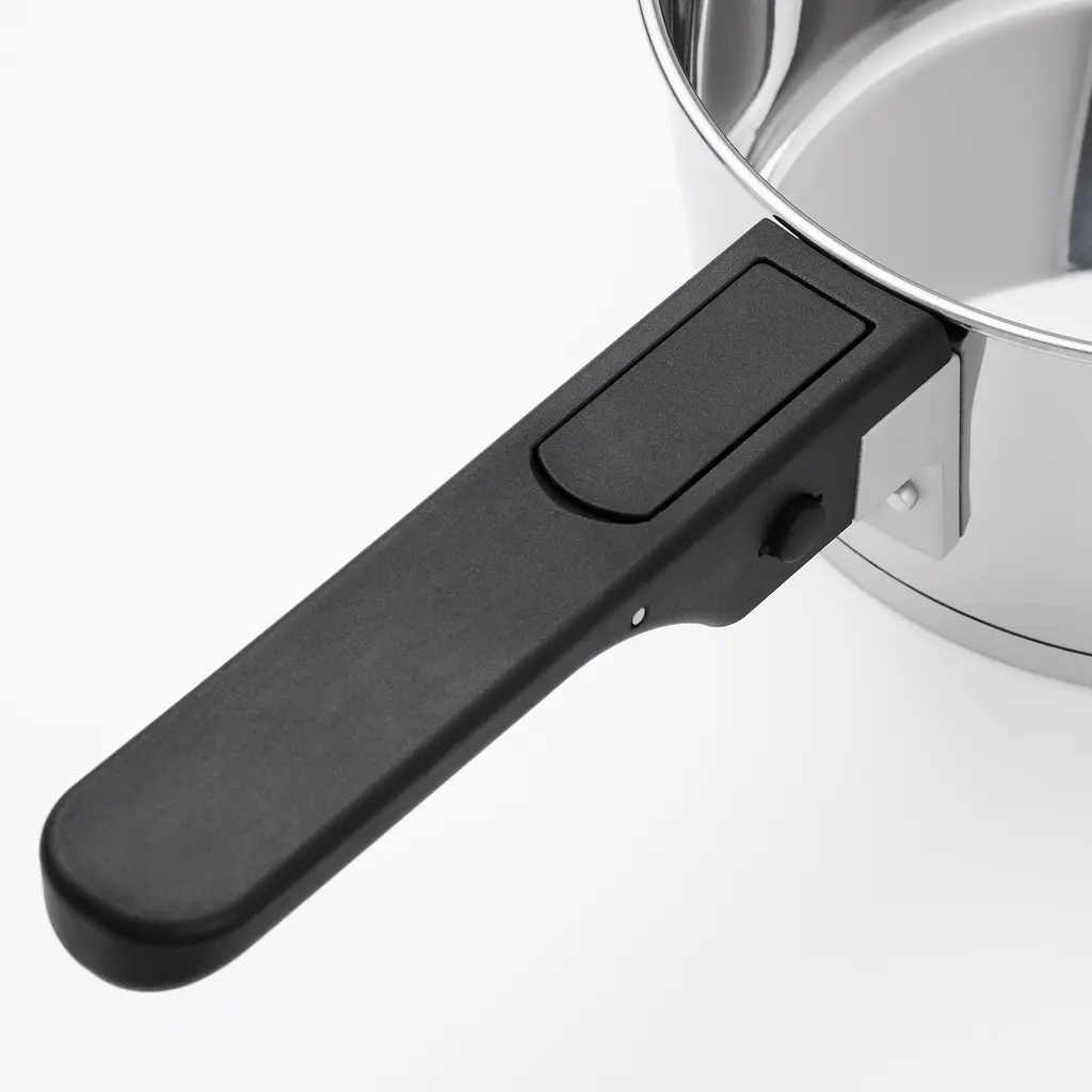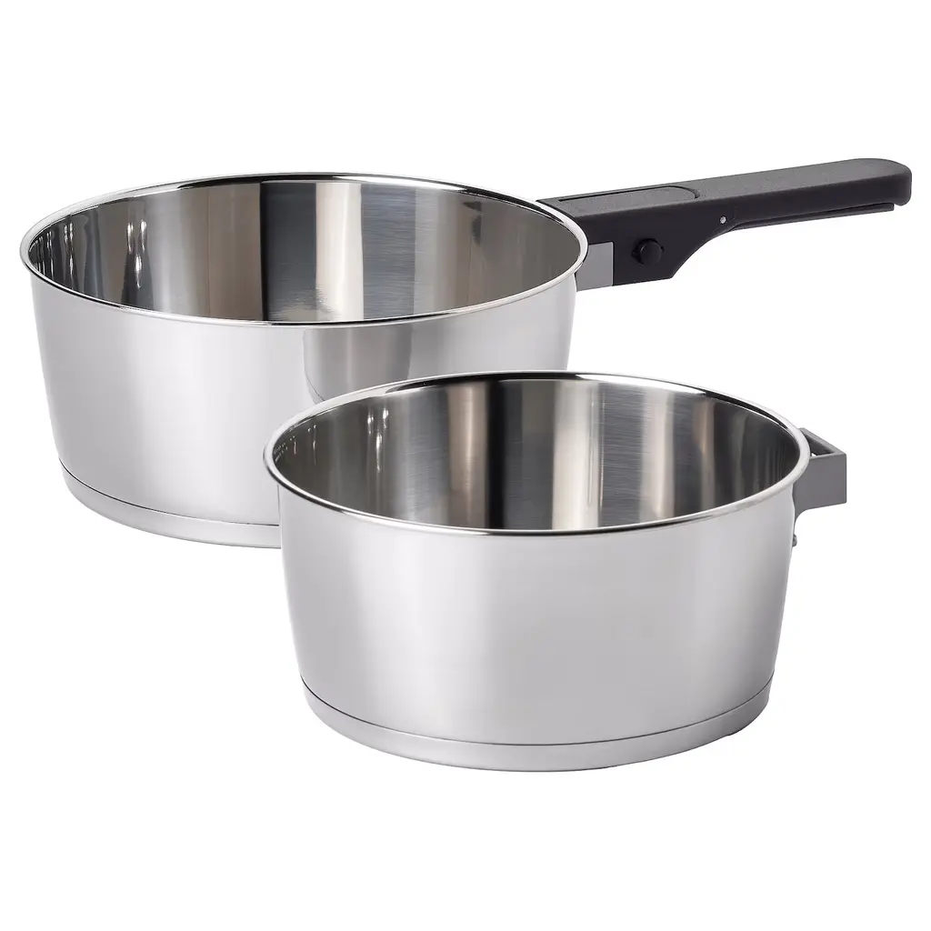 SLÄTROCKA Cookware set with detachable handle - saucepan stainless steel. You easily detach the handle and attach it again by pressing the 2 buttons on the side. The saucepans are easy to stack in the cabinet or drawer since you can remove the handle and place it in the top saucepan.