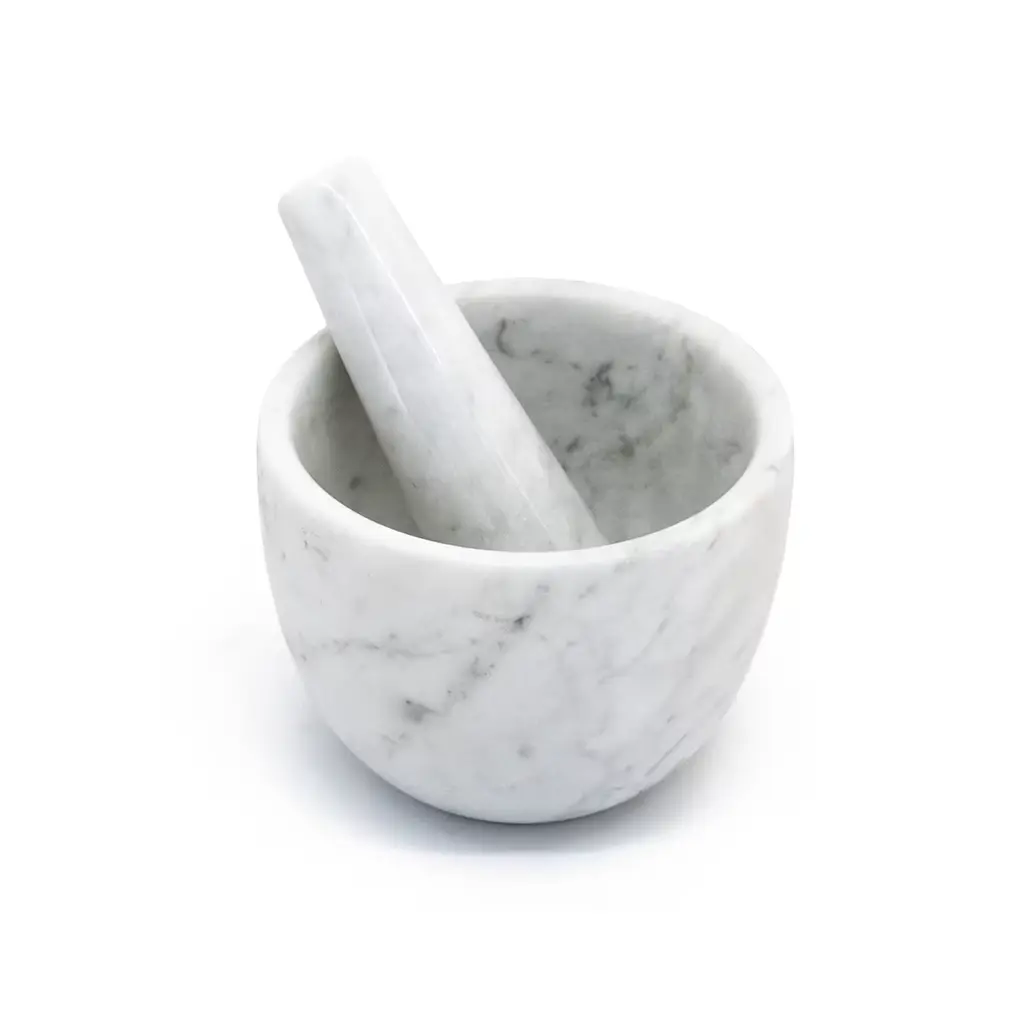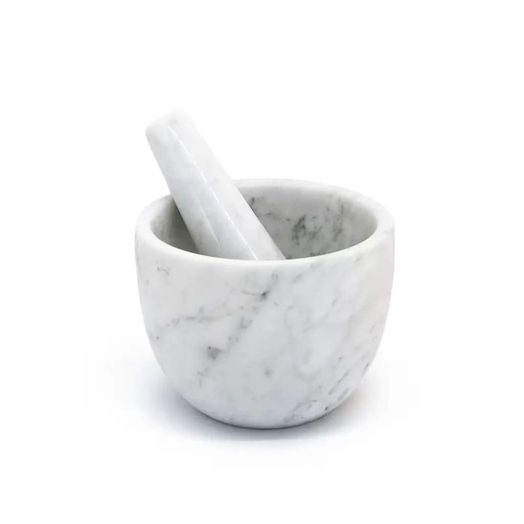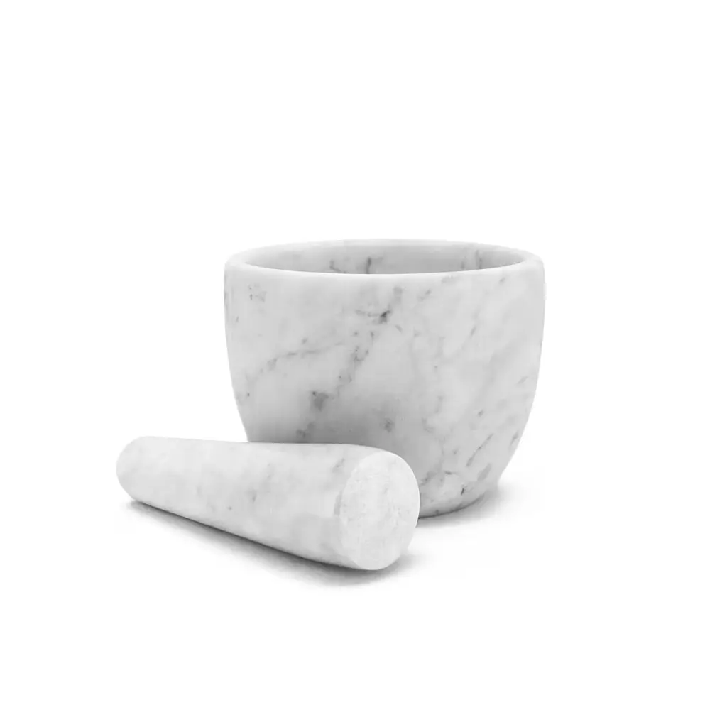 Merging strudy construction with stunning aesthetic, this small set of mortar (Ø 12 cm x H 9 cm) and pestle (Ø 3.5 x H 12.5 cm) is made of white Carrara marble, boasting its characteristic gray veining. It is the perfect choice to complete an elegant tableware set in marble thanks to its unadorned sophistication. A version in black Marquinia marble is also available, please ask the Concierge for details.