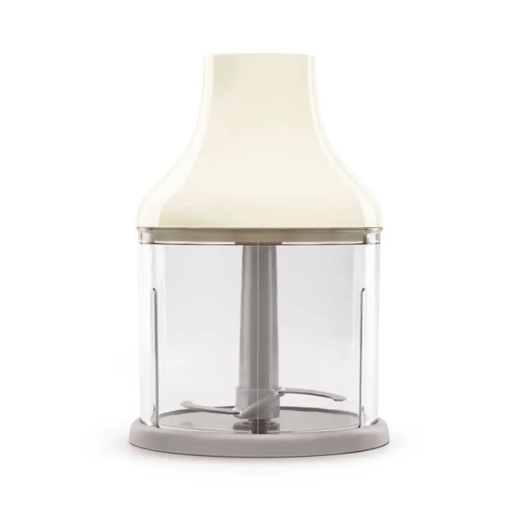 This glossy cream hand blender offers modern functionality with a hint of retro-futuristic style. Five speeds plus a turbo function ensure total control over the blended texture, whether you're making chunky chowder, rustic applesauce or silky ganache. Stainless steel blades make short work of ingredients while the ergonomic handle provides a comfortable hold. A trio of accessories expands the functionality of the immersion blender. The wire whisk whips, the chopping bowl transforms the blender into a food processor and the lidded beaker is the ideal blending and storage vessel.Known for its wonderfully retro refrigerators, SMEG has launched a joyfully designed kitchen appliance collection based on the curved and compact lines of postwar design. SMEG's nod to the past is the star of today's kitchen, incorporating all the current advances in technology.