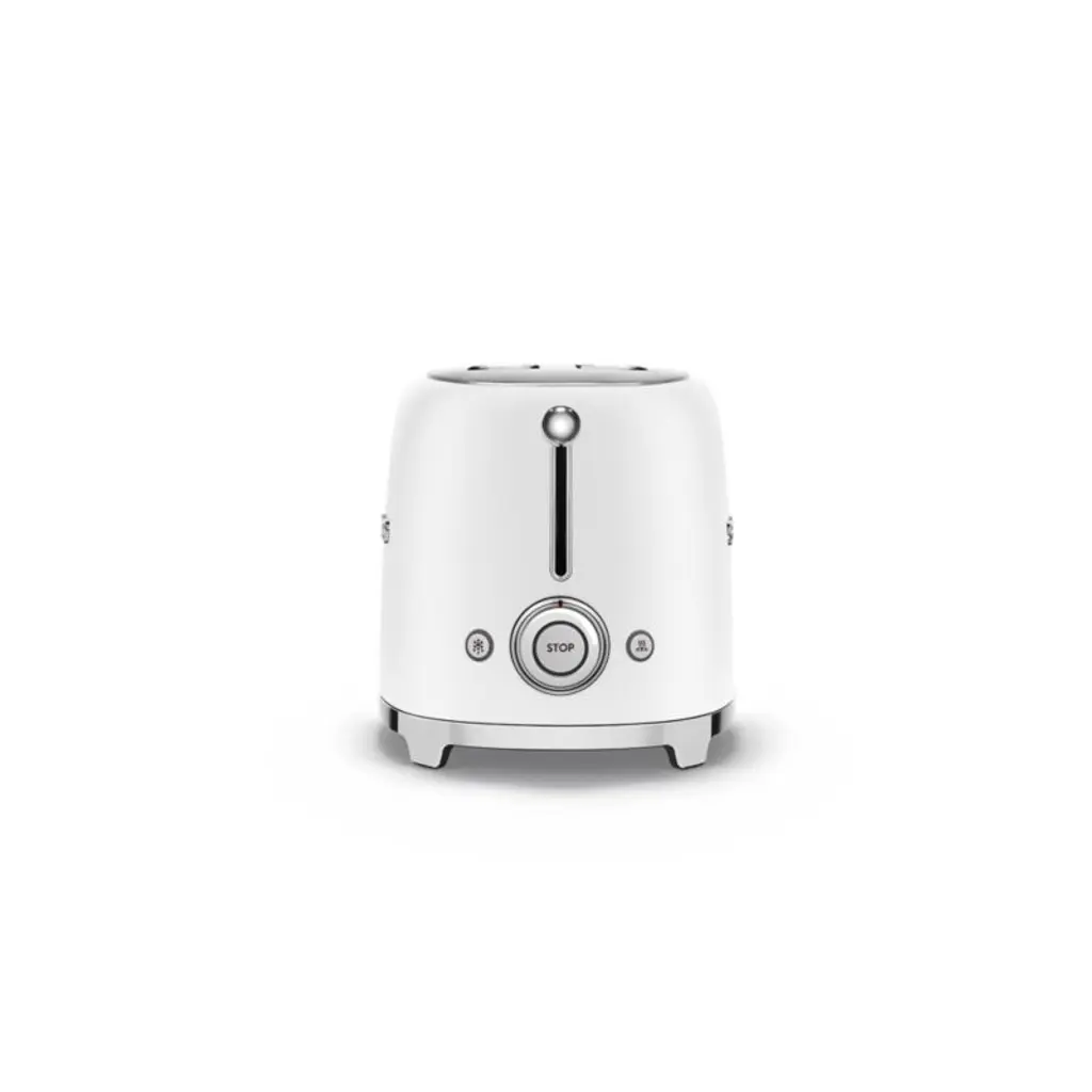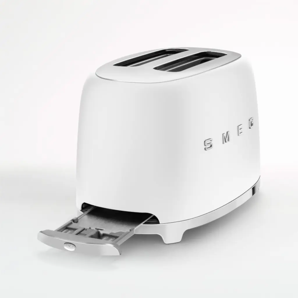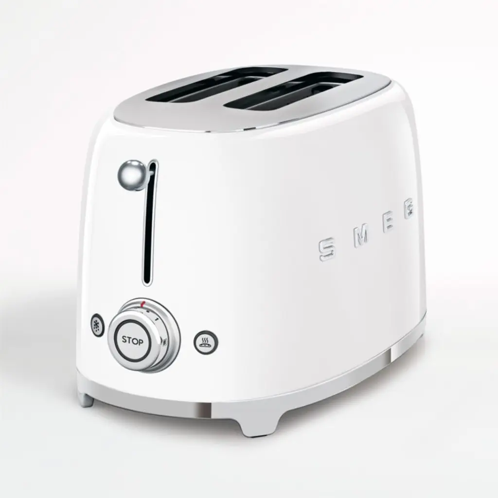 Enameled in modern matte white exclusively for us and accented with a charming ball lever knob, this retro two-slice toaster browns bread, bagels and more at six levels with three convenient pre-set programs. Two extra-wide slots accommodate different slice widths, and self-centering racks ensure even toasting.Known for its wonderfully retro refrigerators, SMEG has launched a joyfully designed retro kitchen appliance collection based on the curved and compact lines of postwar design. SMEG's nod to the past is the star of today's kitchen, incorporating all the current advances in technology.