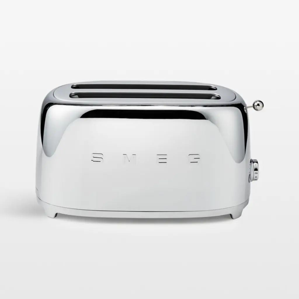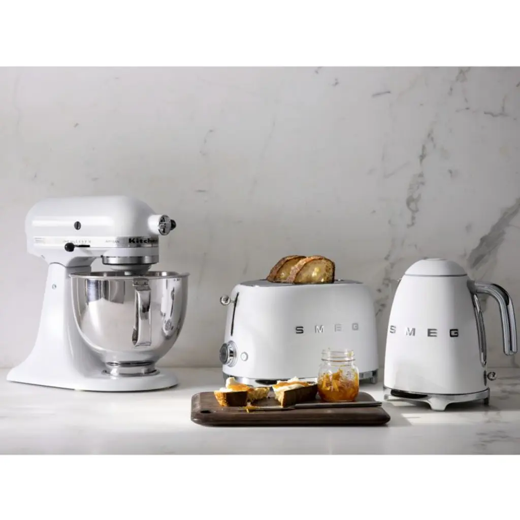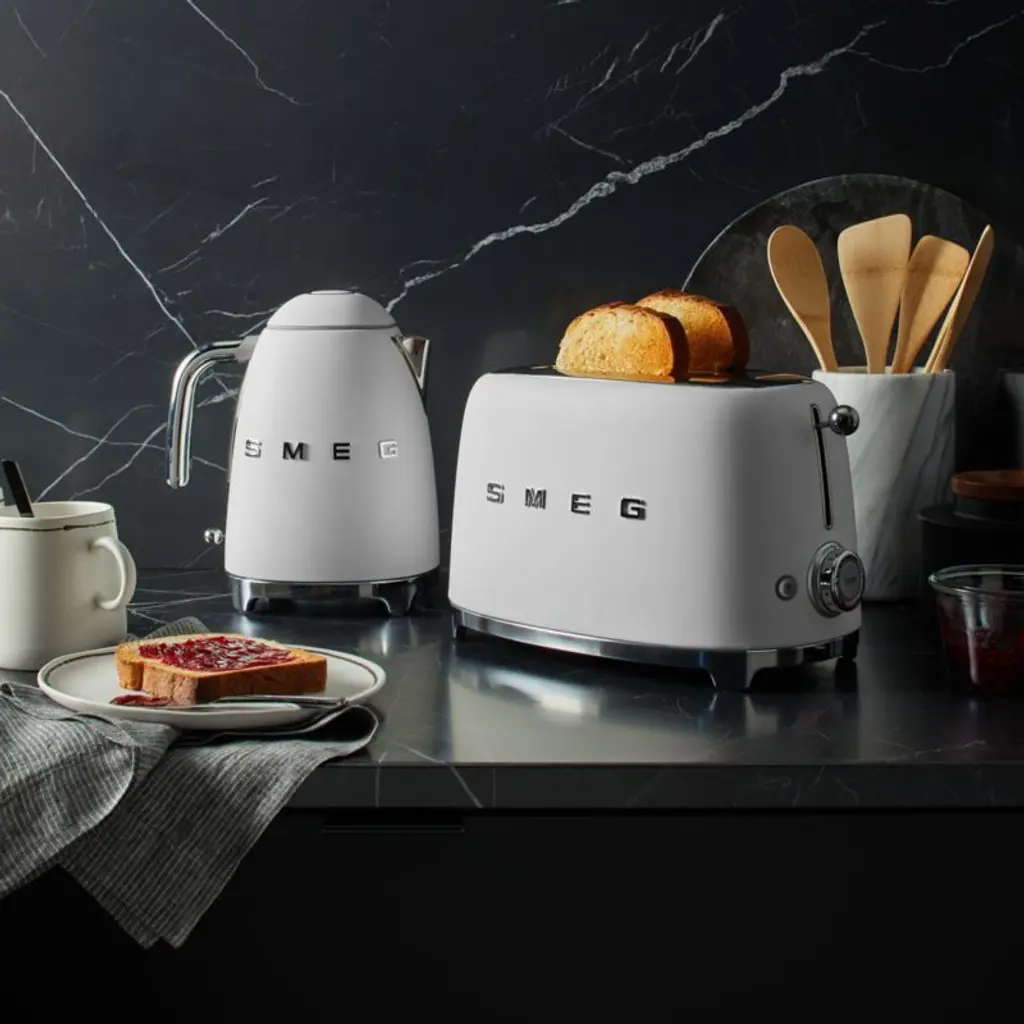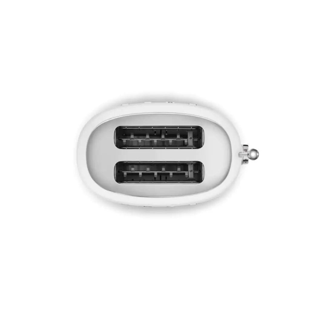 Enameled in modern matte white exclusively for us and accented with a charming ball lever knob, this retro two-slice toaster browns bread, bagels and more at six levels with three convenient pre-set programs. Two extra-wide slots accommodate different slice widths, and self-centering racks ensure even toasting.Known for its wonderfully retro refrigerators, SMEG has launched a joyfully designed retro kitchen appliance collection based on the curved and compact lines of postwar design. SMEG's nod to the past is the star of today's kitchen, incorporating all the current advances in technology.